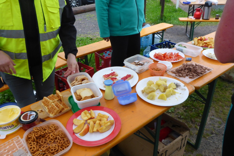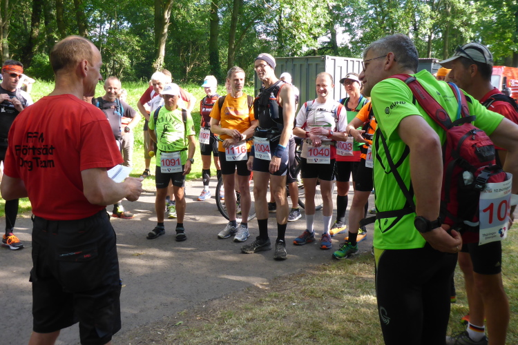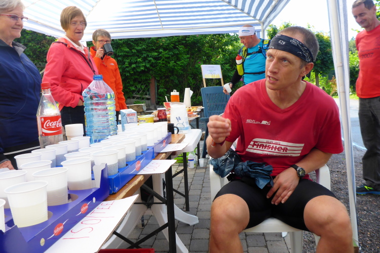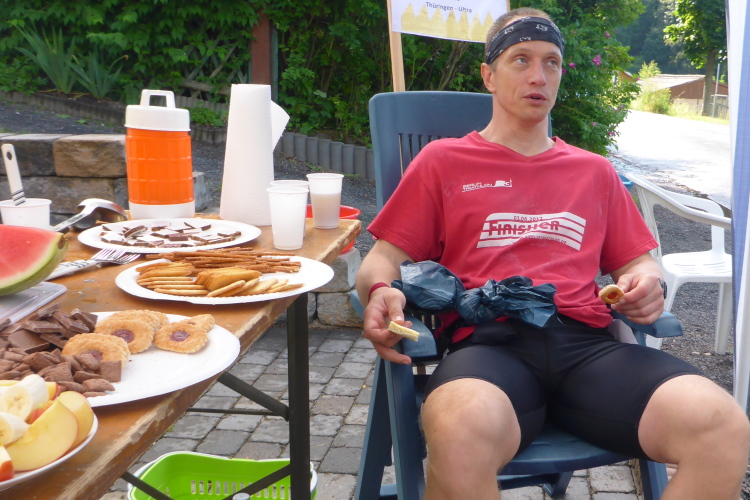 Erfreut stellen wir fest, dass Startnummernausgabe, Start, Ziel, Duschen und Toiletten nur wenige Meter entfernt sind. Auf einem überdachten Platz vor dem Dorfgemeinschaftshaus gibt es ab 18 Uhr die Pasta Party, am nächsten Morgen das Frühstück, ab nachmittags die Siegerehrung und später die Übertragung des Fußballeuropameisterschafts-Viertelfinale Deutschland - Italien. Die Stimmung der Anwesenden könnte nicht besser sein; man trifft Freunde und Bekannte, kann die Füße hochlegen und das wunderbare Wetter genießen. Auffallend für mich ist, dass hier niemand ein Marathon-Finishershirt trägt. Dagegen sind die Shirts vom Thüringen Ultra der Vorjahre omnipräsent. Es gibt wohl viele Wiederholungstäter, was auch an den Sternen an der Brust ersichtlich ist. Denn für jedes Finish bekommt man einen Stern mehr. Selbstverständlich werden auch andere Ultralangstrecken-Shirts spazieren getragen.