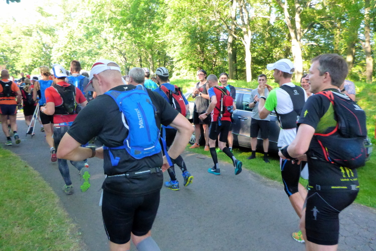 Da die Läufer des 100 Meilen Laufs von 16 bis 22 Uhr zu jeder vollen Stunde starten können, sind einige schon im Wettkampfmodus. Die Läufer müssen ihre Startzeit so wählen, dass sie km 70 zwischen 4 und 7 Uhr am nächsten Morgen passieren. Dort trifft die 100 Meilen Strecke auf die 100 km Strecke. Das heißt also, zu jeder vollen Stunde treffen sich Läufer und Zuschauer unter dem Startbanner. Es gibt ein kurzes Briefing und dann werden die „Ultra“ Ultras mit Applaus auf die Strecke geschickt. Mit jedem Start werden die Gruppen kleiner, da die Schnellen natürlich erst am Schluss loslaufen.