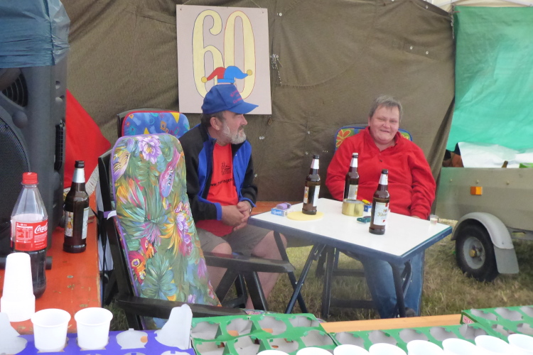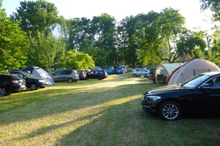 Kann das funktionieren? Es gibt kein Hotel, keine Gaststätte, wo sollen die vielen Menschen bleiben? Norbert und ich sind gespannt. Von Bekannten hören wir, dass man am besten vor Ort zeltet. Also rüsten wir unseren Bus kurzerhand mit Schlafsäcken aus und machen uns auf gen Osten. Meine Begeisterung für Camping hält sich normalerweise in Grenzen. Entsprechend skeptisch erreichen wir den kleinen Ort. Dort ist der Weg perfekt ausgeschildert, bis wir auf einen winzigen Weg stoßen. Bevor wir etwas sagen können, meint der dort platzierte Helfer sofort: „Ihr kommt zum Campen? Dann immer geradeaus.“ Wir folgen den Anweisungen und landen auf einer großen, frisch gemähten Streuobstwiese, die bereits von zahlreichen PKWs, Wohnmobilen, Wohnwagen und Zelten in Beschlag genommen ist. Es gibt noch einen netten Parkplatz zwischen anderen, die wohl ebenfalls im Auto übernachten wollen.