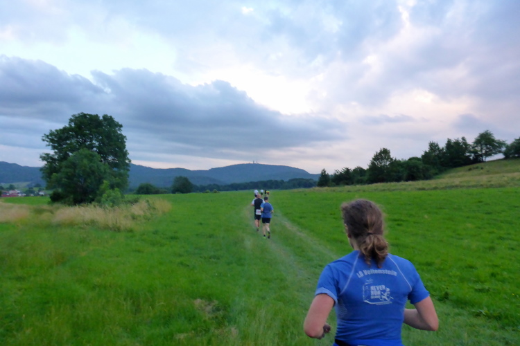 Kurz vor Brotterode liegt die nächste VP bei km 33. Ein 100 Meilen Läufer berichtet, dass er wohl bei der nächsten VP aussteigen wird. Mit schlimmen Schmerzen in der Leiste sind die restlichen 60 km nicht mehr machbar. Schade, aber so etwas kann immer passieren und schließlich steht die Gesundheit an erster Stelle. Es geht über die L1127 und zwischen blühenden Wiesen wieder bergauf. Hinter einer Kurve wartet eine Fotografin. Das gibt bestimmt ein tolles Bild, die Aussicht ist wunderbar.