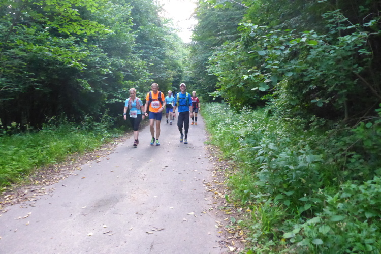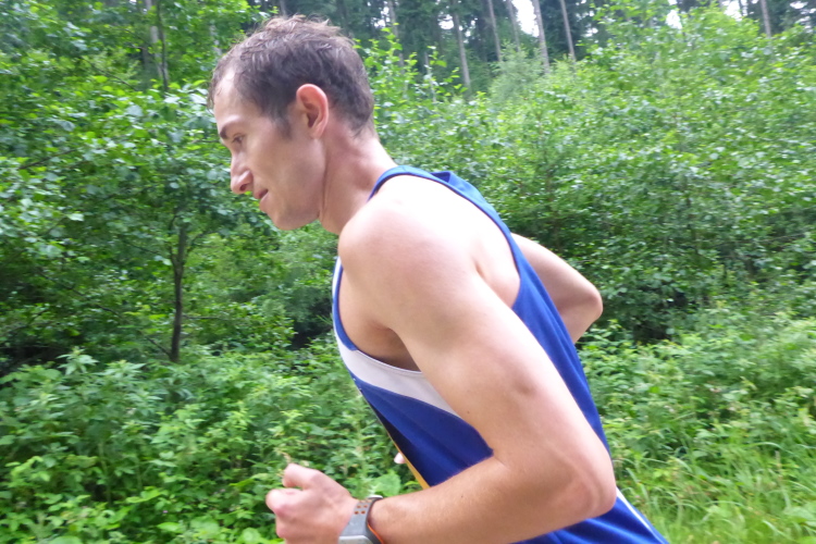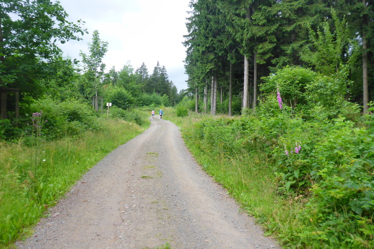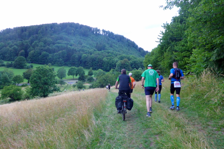 Es geht weiter bergauf. Ich bin in Gedanken versunken, als vor mir plötzlich ein Helfer auftaucht. Es gibt ja doch noch eine Getränkestation! Der Posten klärt auf, dass er normalerweise aktiv am Lauf teilnimmt, aber das diesmal nicht kann. Wegen der Hitzeschlacht im letzten Jahr hat er beschlossen, hier auf dem Gipfel der Steigung nochmal für Getränkenachschub zu sorgen. Ich nehme Apfelsaftschorle und bedanke mich herzlich. Der Weg scheint kein Ende zu nehmen. Ich frage den nächsten Läufer, wann es denn endlich wieder bergab gehen würde. Er meint, gleich gehe es hinunter zur Ebertswiese und dann ganz lange bergab. Nanu, die Ebertswiese kenne ich vom Rennsteiglauf. Da geht es hinterher bergauf. Hoffentlich ist das kein Missverständnis.