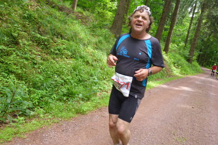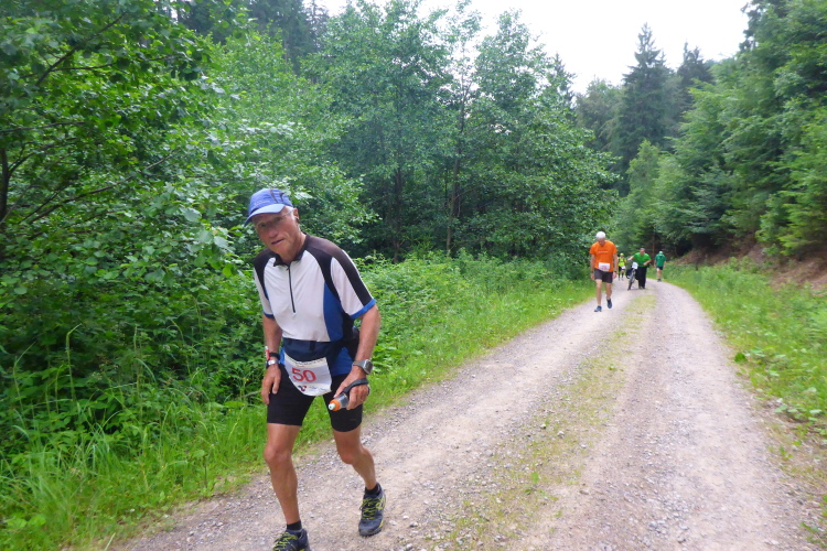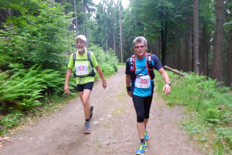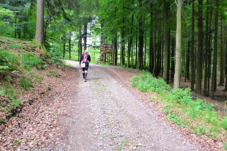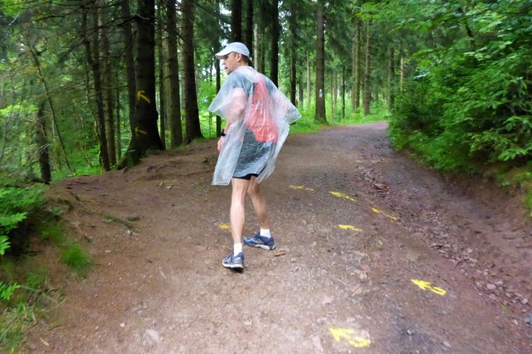 Ich habe ebenfalls einen Umhang im Rucksack und eine andere Helferin unterstützt mich beim Überziehen. Nach ausgiebiger Stärkung an der VP macht der Regen nichts mehr aus. Der Weg führt wieder in den Wald und das grüne Dach hält sowieso die meisten Regentropfen ab. Es ist schon 10 Uhr und ich bin bei km 39. Bei km 42 haben wir mit knappen 800 m den höchsten Punkt der Strecke erreicht. Auf dem nun folgenden Bergabstück kann ich vorne die Silhouette eines mir bekannten Läufers erkennen. Friedbert hat mir schon Anfang des Jahres berichtet, dass er vorhat, beim Thüringen Ultra die 100 Meilen in Angriff zu nehmen. Sein aufwendiges Training hat sich offensichtlich gelohnt. Er ist locker unterwegs und erkundigt sich an der VP nach dem Kilometerstand. Wir sind bei km 43; er hat also schon mehr als 100 km hinter sich und sieht noch gut aus - Kompliment.