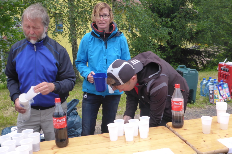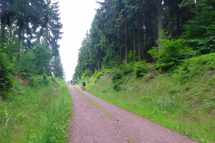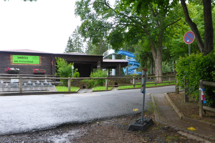 Hohe Fichten und der Duft nach frischen Nadeln erinnern mich an den Schwarzwald. Nach langem Aufstieg kann ich oben Häuser erkennen. Doch unser Weg zweigt vorher ab. Ich bin leicht enttäuscht, es könnte doch langsam wieder eine VP auftauchen. Dann sehe ich oberhalb eine Wasserrutsche. Das hätte ich hier am wenigsten erwartet. Obwohl das Bad beheizt ist, ist heute wenig los. Neben dem Freibad gibt es hier noch einen kleinen Freizeitpark mit der Parkeisenbahn "Flinker Lothi" und eine Bungalowanlage. Für mich ist allerdings die VP bei km 76 wichtiger. Endlich kann ich mich wieder stärken.