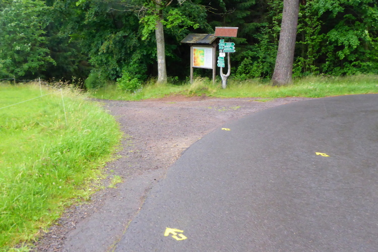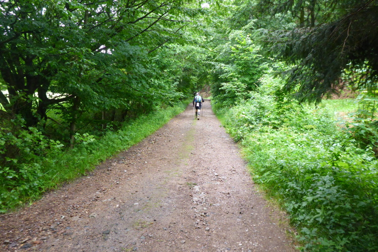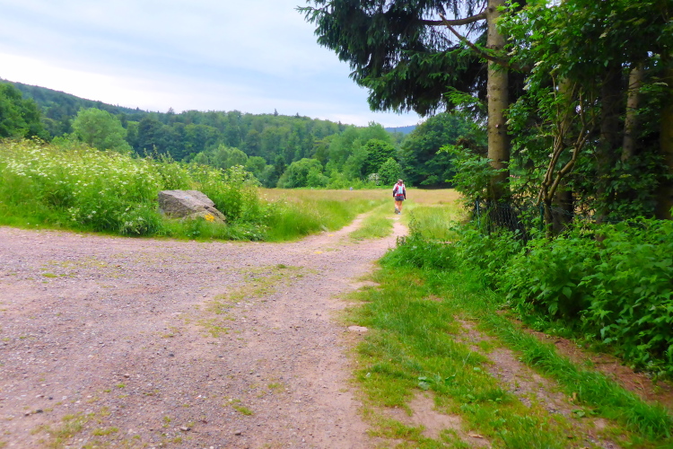 Weiter geht es über einen schmalen Wanderweg. Dann über die Straße auf den nächsten Waldweg, diesmal bergab. Oh je, schon wieder Steine. Für meine Füße ist das gar nicht gut. Es geht wellig weiter. Die Untergründe wechseln, ich bin müde. Erneut geht es steil bergab. Teilweise steinig, teilweise von tiefen Rinnen durchzogen, führt der Weg hinunter. Alle paar Meter ist eine Abflussrinne aus Beton quer zum Weg eingelassen. Das hört sich schlimmer an, als es ist. Man muss sich nur höllisch konzentrieren.