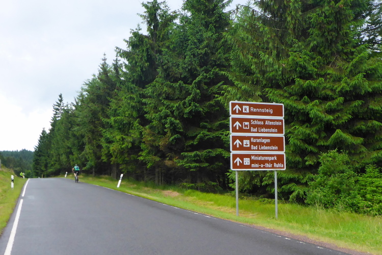Ab km 47 geht es plötzlich steil bergab. Der steinige Weg ist kein Vergnügen. Mal flacher mal steiler, verlieren wir rasant an Höhenmetern. Als ich schon nicht mehr kann, geht es scharf rechts auf den asphaltierten Mommelstein-Radweg. Auf der Trasse der ehemaligen Bahnstrecke Schmalkalden - Brotterode wurde im Juni 2003 dieser schöne Radweg eröffnet. Die schroffe Bebauung rechts und links ist mittlerweile überwuchert und man glaubt sich in einer tiefen Schlucht. Wir unterqueren eine hohe Brücke, bevor sich die Landschaft wieder öffnet. Hier liegt auch die nächste VP hinter km 49. Ich muss mich setzen, denn das lange Bergablaufen fordert seinen Tribut.