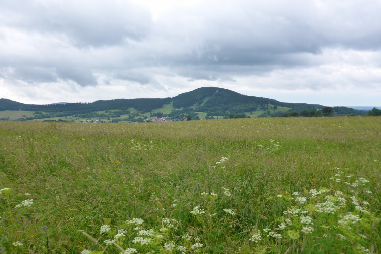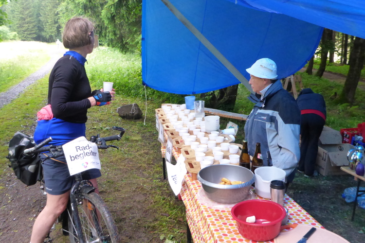Wir verlassen den Wald und eine weite Wiesenlandschaft liegt vor uns. Im Hintergrund erhebt sich der markante Große Inselsberg. Zwischen den Örtchen Seebach und Schmerbach überqueren wir die B88. Ein Helfer sichert den Übergang. Auf der anderen Straßenseite erwartet uns bereits die 2. VP bei km 16. Ich bitte einen Helfer, mir die Mütze aus dem Rucksack zu holen. Ich werde von einer Horde Mücken verfolgt und brauche Schutz von oben. Das reichhaltige Essensangebot lasse ich vorerst noch liegen.
