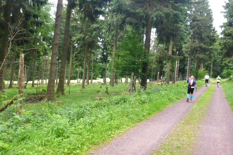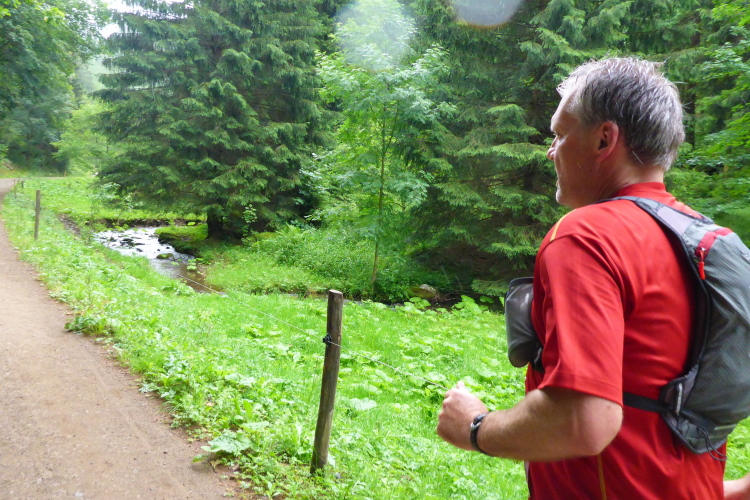 Was jetzt folgt, ist Trailrunning in Reinkultur. Links fließt die Spitter ihrem Fall entgegen, rechts geht es sanft bergauf. Kurz denke ich an die Radbegleiter. Das ist für sie sicher nicht so lustig. Ich lasse mir aber die Laune nicht verderben. Leider ist der Spitterfall zu weit weg um ihn zu sehen, dafür kann ich mich ganz auf den Weg konzentrieren, denn aufpassen muss man schon. Ein paar Mal knicke ich leicht um, was, bei vermutlich angeschwollenen Füßen, recht schmerzhaft ist. Richtig passiert ist mir, Gott sei Dank, nichts.