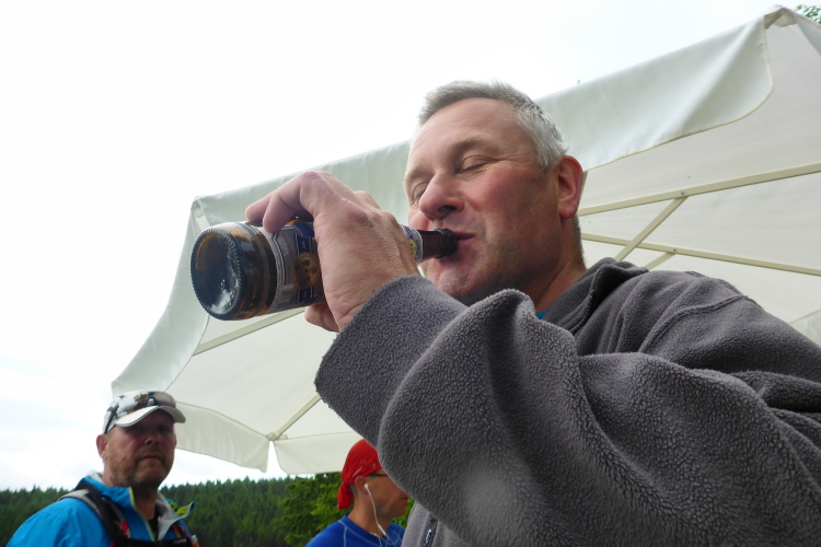 Hinter km 71 kommt die nächste VP in Sicht. Die drei Helfer sind ein eingespieltes Team. Während mich zwei mit allem versorgen, was man so braucht, sucht der dritte meinen Namen auf der Liste. Gleich bemerkt er, dass ich zum ersten Mal dabei bin und lädt mich für das nächste Jahr ein. Wir halten ein Schwätzchen, bis ein 100 Meilen Läufer eintrifft. Andreas tun die Füße (und vielleicht noch einiges andere) weh. Ich ziehe meine Mütze vor Hochachtung und überlasse ihn der netten Betreuung durch die Helfer.
