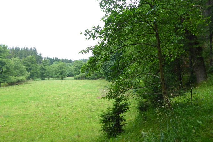 Dann liegt sie aber doch unter mir, die Ebertswiese. Hier ist beim Rennsteiglauf Halbzeit und ziemlich viel Halligalli. Heute liegt sie friedlich da, ein üppig blühendes Naturschutzgebiet. Im sumpfigen Gelände entspringt die Spitter, die kurz unterhalb der Ebertswiese im Spitterfall, den mit 19 Metern höchsten natürliche Wasserfall in Thüringen bildet. Der Läufer von vorhin ist bereits unten. Er ruft mir zu, dass hier ein scharfer Abzweig nach links wäre. Schon vorher kann ich drei gelbe Ausrufezeichen auf dem Waldboden erkennen. Die Pfeile zeigen unmissverständlich nach links. Der Weg ist kaum zu erkennen. Der Läufer lässt mir den Vortritt.