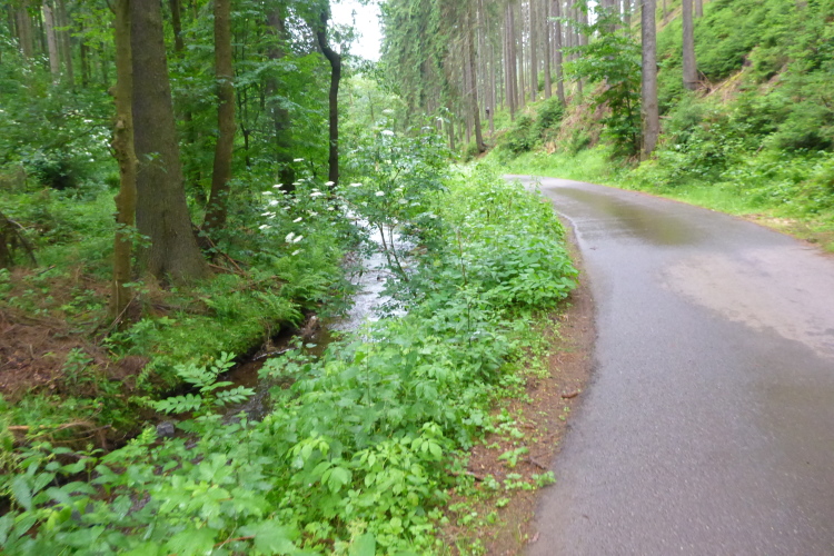 Es geht nun steil bergab. Das ist allerdings kein Vergnügen, denn der Weg ist steinig. Mehrmals knicke ich um. Ich versuche es langsamer, das ist auch nicht besser. Der Weg wird flacher und die Steine weniger; jetzt geht es wieder. Eine kurze Matschpassage unterbricht nur kurz meinen Lauf. Von links kommt die Leina, die hier ein wunderbares Tal geschaffen hat. Die Natur explodiert förmlich und erschafft massenhaft Grün. Finsterbergen liegt hinter hohen Bäumen versteckt. Ein Sägewerk und eine kleine Industrieansiedlung lassen wir seitlich liegen, dann geht es über die K9. Hier muss man ein bisschen aufpassen, denn es kommt doch hin und wieder ein schnelles Auto. Auf der anderen Seite geht es in den Wald hinein und wieder den Berg hinauf.