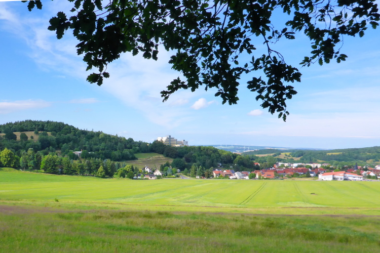 Ich überhole Karl, der mit seiner Conni auf den 100 Meilen unterwegs ist. Wir werden uns auf den nächsten Kilometern noch öfter begegnen. Zwischen den Bäumen kann ich Hohleborn unter uns liegen sehen. Bald geht es scharf links und der Sportplatz von Floh-Seligenthal (km 54,5) ist erreicht. Hier soll der 2. Staffelwechsel sein. Die Staffeln sind wohl alle schon durch. Ich muss mir nun eine längere Pause gönnen. Meine Beine sind krampfig und ich bin platt. Volker tröstet mich aber: „ Jetzt noch ein paar Kilometer, dann folgt nur noch ein Marathon, und das ist ja Kurzstrecke.“ Obwohl sich das komisch anhört, bin ich jetzt wieder motiviert. Wir verlassen das Sportgelände über die Rückseite auf einem Wiesenweg. Nach dem langen Bergablaufen, gönne ich mir nun eine längere Gehpause. Der Weg ist flach und so wechsle ich später Gehen mit Laufen ab.