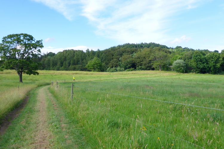 Anlaufen gestaltet sich daher etwas schwierig. Das moderate Gefälle hilft mir erneut, einen runden Schritt zu finden. Entgegenkommende Radler müssen ganz schön schnaufen. Mittlerweile hat es wieder zu regnen begonnen. Ich habe keine Lust nach der Jacke zu kramen, so schlimm sind die paar Tropfen nun auch wieder nicht. Ich bewundere die schöne immer wieder wechselnde Gegend. Auf Grund des Gefälles komme ich gut voran. Weite Wiesen und Waldpassagen wechseln sich ständig ab. Der Asphalt ist dabei eine Wohltat für die Füße. Es geht über eine Brücke, die rechts und links von hohen Metallzäunen gesäumt ist. Dahinter liegt der alte 86 m lange, beleuchtete Hundsrücktunnel (Kleinschmalkalden-Tunnel). Obwohl es im Tunnel furchtbar zieht, ist er eine willkommene Abwechslung.