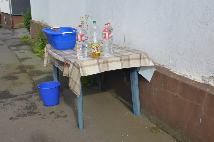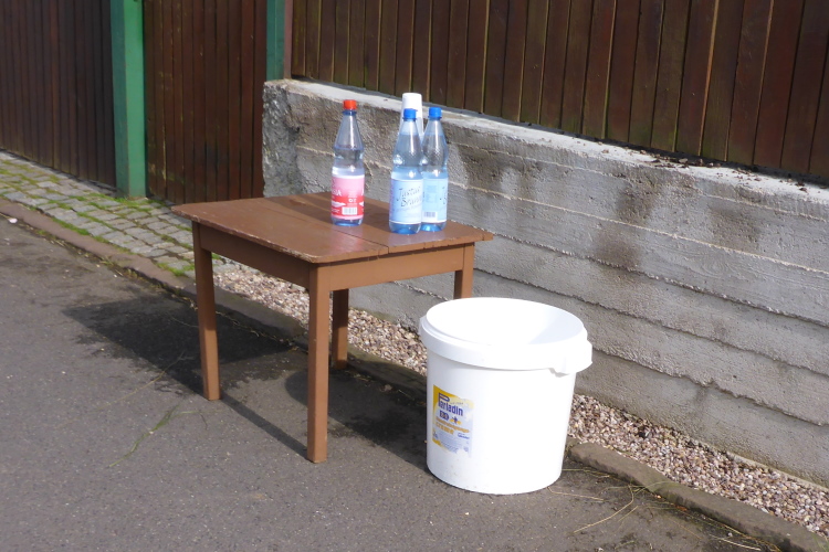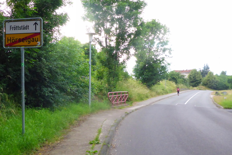 In Hörselgau ist die Fröttstädter Straße leer. Die Leute bereiten sich wohl auf das Fußballspiel vor. Eine einsame Wasserwanne zeigt mir, dass trotzdem mit den Läufern gelitten wird. Km 99. Kann es sein, dass die Kilometer immer länger werden? Ein letztes kleines Gefälle bringt uns unter der Bahnlinie hindurch, auf der anderen Seite geht es die letzte Steigung hinauf. Wir passieren das Fröttstädter Ortsschild, nochmal über die Straße, da steht ein Helfer, der über Funk die Startnummern der ankommenden Läufer weiter gibt. In diesem Moment begreife ich, dass ich das Vorhaben 100 km Thüringen Ultra tatsächlich bewältigt habe.