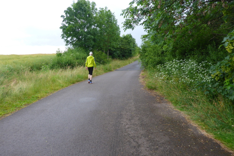 Es geht nun über die L1025. Noch lange kann ich die Musik hören und dem Ansager lauschen. Hinter einem Parkplatz geht es eine kleine Böschung hinauf. Dort sitzt eine einsame Radlerin und wartet wohl auf ihren Läufer. Sie spendet mir Beifall. Dann geht es in ein großes Industriegebiet und eine endlose Straße entlang. Ich muss abwechselnd gehen und laufen. Die Schmerzen in meinem rechten Fuß sind mörderisch.