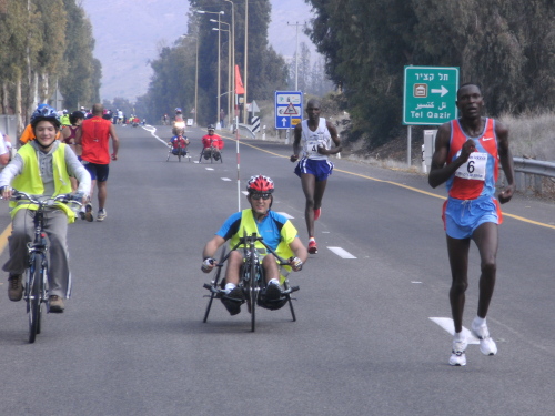 Immer wieder auch kamen uns einzelne Handbiker auf ihrem Rückweg entgegen. Auch für Handbiker ist der Tiberias Marathon sehr zu empfehlen. Trotz der vielen Freizeitanlagen um den See machte die Landschaft einen gepflegten Eindruck. Straßen und Plätze sind sauber. Außer leeren Trinkbechern und Plastikflaschen der Marathonläufer sahen wir keinen Müll herumliegen. Auf dem Rückweg konnten wir bereits freundliche Helfer beim Einsammeln des Marathonmülls beobachten.