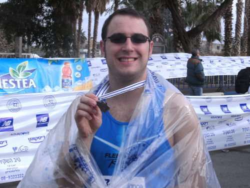 In Tiberias angekommen, gingen wir bei Regen in das Stadtzentrum zum Golden Tulip Hotel. Dort war im Foyer eine kleine Marathonmesse und im Untergeschoss konnten wir die Startunterlagen abholen. Rasch erhielten wir unsere Unterlagen. In den Startbeuteln gab es neben einem Funktionsshirt noch eine weitere nette Überraschung. Jeder Teilnehmer erhielt eine Schachtel Datteln, die wir uns nach dem Rennen auch schmecken ließen. Zur Zeitmessung fand jeder Starter einen Leihchip in seinen Starterbeutel, den er nach dem Lauf zurückgeben musste um im Gegenzug die schöne Finisher-Medaille zu erhalten.