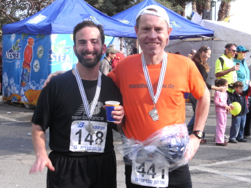 Wir waren begeistert und ließen es uns schmecken. Dabei kamen wir mit vielen anderen Startern ins Gespräch. Das Telnehmerfeld war international. Die rund 1.200 Teilnehmer kamen aus 33 Ländern. Wir trafen u. a. Deutsche, Amerikaner, Schweden, Tschechen und den einzigen Teilnehmer aus Belgien. Viele nutzten wie wir die Teilnahme am Marathon zu einem Urlaub in Israel.