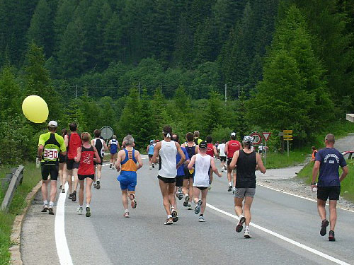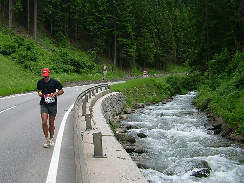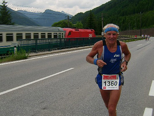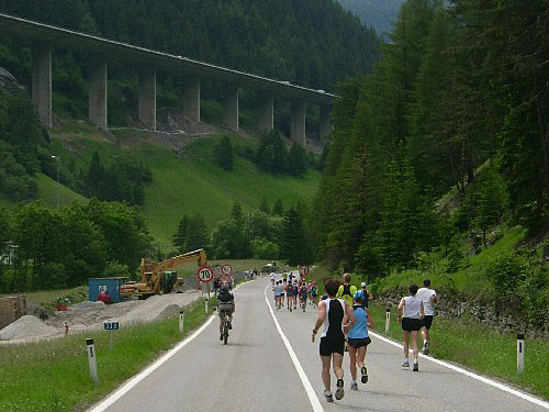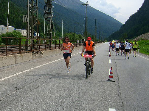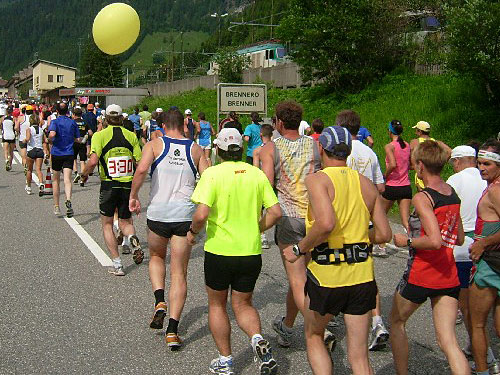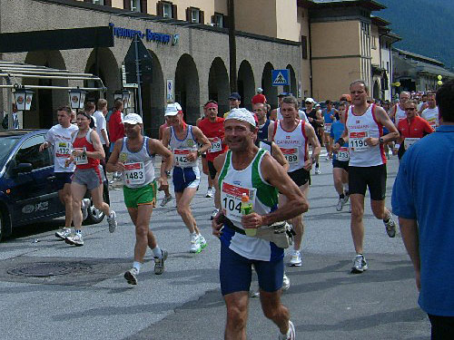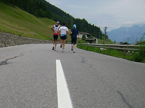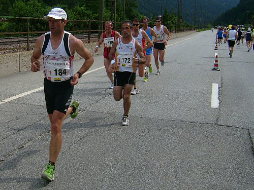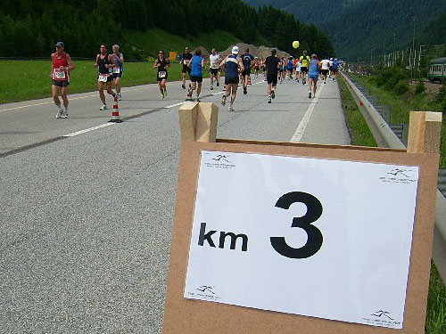 Wir sammeln zuerst die notwendigen vier Kilometer auf der Passhöhe, laufen zum alten Grenzgebäude, biegen dort links ab und rennen wieder Richtung Süden am Startplatz vorbei. Der führende Marathoni kommt entgegen und hat bereits eine Mordsvorsprung, ich schätze mal rund 200 Meter. Die Wende kommt und es geht leicht bergan wieder nach Brennero hinein. Zahlreiche Zuschauer aus den Gasthöfen und Geschäften, auch zwei deutsche Beamte der Bahn AG schauen zu und feuern uns an. Den Zeitläufer habe ich rund 100 Meter vor mir im Blickfeld. Wir überlaufen die Staatsgrenze Italien – Österreich und sind jetzt im Ortsteil Brenner, der von wenigen Häusern gebildet wird. Unsere Strecke wird leicht fallend.