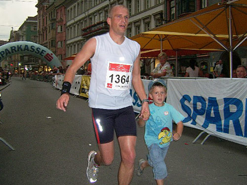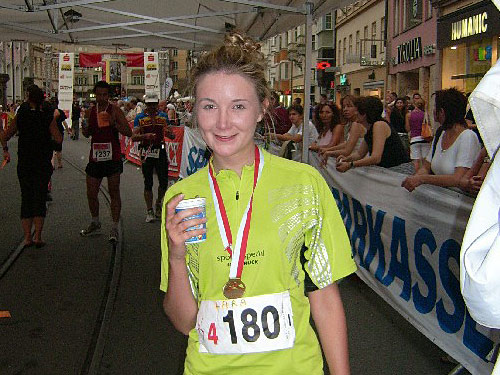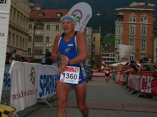 Ein Österreicher leistet uns Gesellschaft. Ich sage, „wir laufen gemeinsam ins Ziel und nehmen die Dame in die Mitte.“ Der Österreicher muss dann leider abreißen lassen. Wir erkennen das Ziel auf der Maria-Theresien-Straße. Zuvor müssen wir noch eine Spitzkehre hinter uns bringen, wir nehmen uns an der Hand und laufen lachend durch das Ziel.