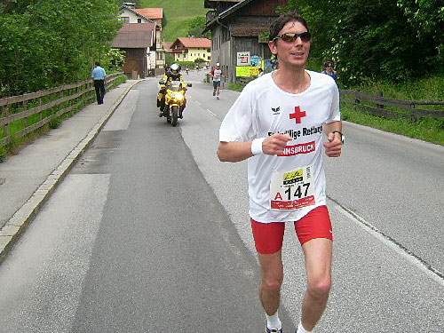 Mittlerweile hat sich der Himmel bewölkt, die Wärme hält sich gerade so in Grenzen. Mir geht es gut, zudem ich immer wieder Läufer einsammeln kann. Unter anderem laufe ich auf den Läufer mit der 100 auf dem Trikot auf und frage entsprechend nach. Es ist der Christian, und die 100 hat den Grund, da die Freiwillige Rettung Innsbruck, ein Verein auf Gemeinnützigkeit, heuer das 100jährige Jubiläum feiert. Ich wünsche ihm viel Glück und renne weiter.