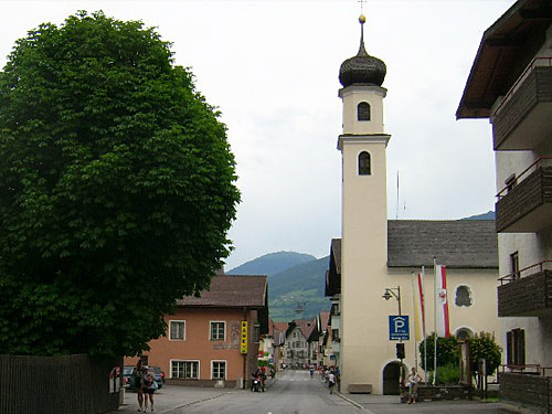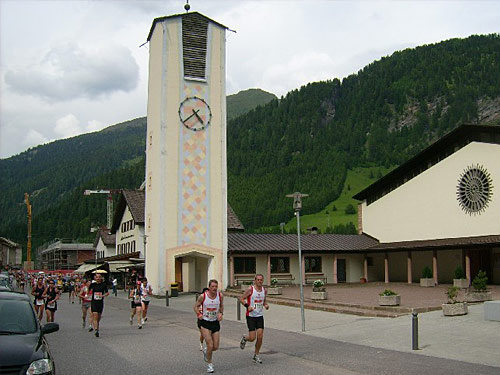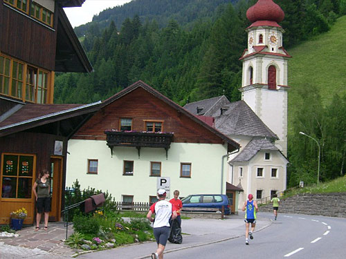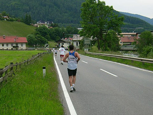 Die Halbzeit feiere ich in Matrei (980 m). Ich blicke beim Starttransparent auf die Uhr und registriere so 1.37 Stunden. Auch hier ist der geschlossene Ortskern an der Bundesstraße. Als locus matereia wurde der Ort 955 erstmals in einer Urkunde erwähnt. Das Marktrecht wurde bereits 1200 verliehen. Der rege Güter- und Personenverkehr über den Brenner brachte auch hier wirtschaftlichen Aufschwung, der aber mit der Eröffnung der Brennerbahn deutlich abnahm. An der Straßenabzweigung nach Maria Waldrast, einer Wallfahrtskirche, hat die Feuerwehr wieder eine Dusche eingerichtet.