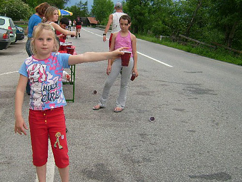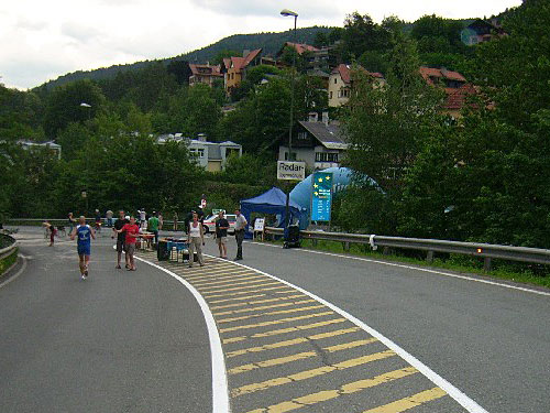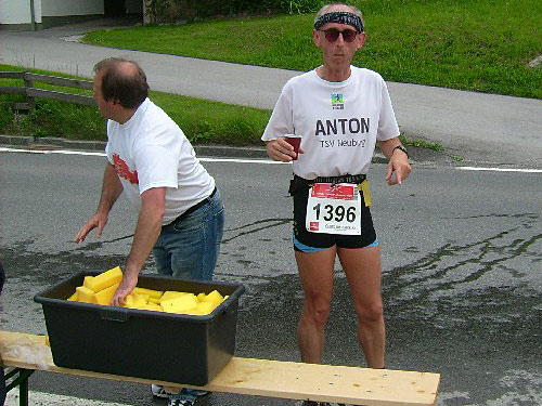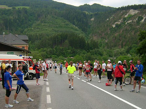 Die folgende Trinkstelle wird launig angekündigt mit einem Bild, wo der Läufer auf allen Vieren daherkommt und wo diesem schon die Hose heruntergerutscht ist. Da muss ich laut lachen. Ein Mitarbeiter des ÖÄMTC wird von mir zum Fotografieren engagiert. Überhaupt erwähnenswert sind die zahlreichen Helfer, die der Veranstalter aquiriert hat. Bundesbahn, Polizei, Feuerwehr, Hilfsdienste, Kinder, an jedem Abzweig steht mindestens einer dieser fleißigen Hände.