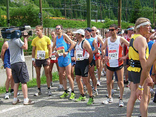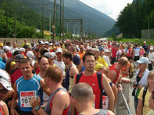 Während der Verkehr auf unserer Laufstrecke noch kurz vor 16.30 Uhr fließt, schafft man es, ein Starttransparent und die notwendigen Absperrungen und Zeitmatten anzubringen. Mir läuft Günter Jeblick aus meiner Heimat sowie der „Chemnitzer“ Dietmar John über den Weg. Letzterer hat bisher keinen Lauf hier ausgelassen und will heute wieder in gut fünf Stunden finishen. Mein Ziel ist eher auf den 3.30 Stunden-Zugläufer ausgerichtet. Schließlich werden wir aufgerufen und stellen uns auf. Die letzten Sekunden werden deutsch und italienisch heruntergezählt und mit einem verzögerten Schuss aus der Pistole werden wir auf die Reise geschickt.