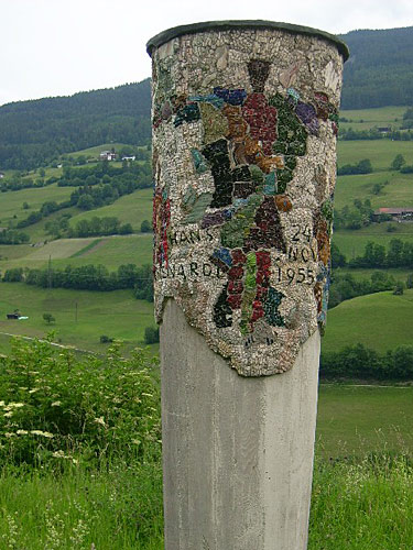 Im Gasthof Schupfen hatte Andreas Hofer 1809 während seiner Schlacht am Bergisel sein Hauptquartier. Wir hören schon seit geraumer Zeit Trommlertöne. Ich suche und finde auch an der Anschlussstelle Innsbruck Süd keinen Musikanten. Etwas gewöhnungsbedürftig ist hier die Verkehrsführung. Wir rennen links an der hier befindlichen Tankstelle vorbei, zum Teil sogar auf dem Autobahnzubringer. Halbrechts erkenne ich die Sprungschanze auf dem Bergisel, wo immer das dritte Springen der Vierschanzentournee stattfindet. Wenn wir noch weiter nach rechts schauen, sehen wir eine markante Spitze und darauf einen Sendeturm. Es ist der 2246 Meter hohe Patscherkofel, der zu den Tuxer Alpen gehört. Hier fanden 1964 und 1976 die olympischen Abfahrtsrennen statt.