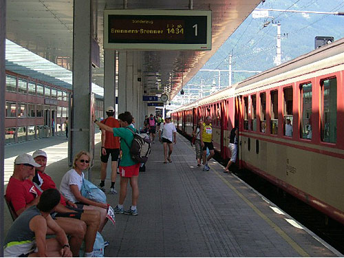 Nach einer Ruhephase packen wir unsere Siebensachen und machen uns auf den Weg zum Hauptbahnhof. Da fällt uns ein ungepflegter Mann mit Rübezahlbart auf. „Des is ein Wurzelsepp,“ sage ich. Im Umfeld sehen wir Bierflaschen stehen. Der Sonderzug der Läufer zum Brenner ist am ersten Gleis schon bereitgestellt. Wir steigen ins Abteil. Für uns Läufer dient die Startnummer als Fahrausweis.
