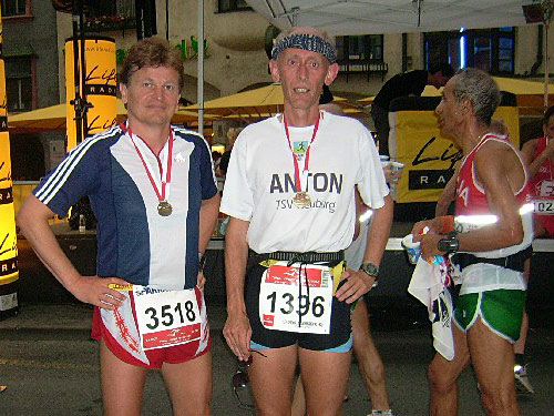 Der Armin kommt schon entgegen und bringt was für den Durst: Bier, juhu. Wir setzen uns aufs Podest, die Eva Färberböck ist total happy, aber auch ein wenig groggy, da sie ein wenig zu schnell angegangen ist. Sie wird aber Gesamtdritte bei den Frauen in netto 3.16.18 Stunden. Bei mir zeigt später die Ergebnisliste den 33. Gesamtplatz in 3.16.07 Stunden. Der Klaus wird mich später wohl wieder als Speed Junkie anreden.