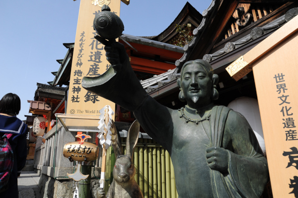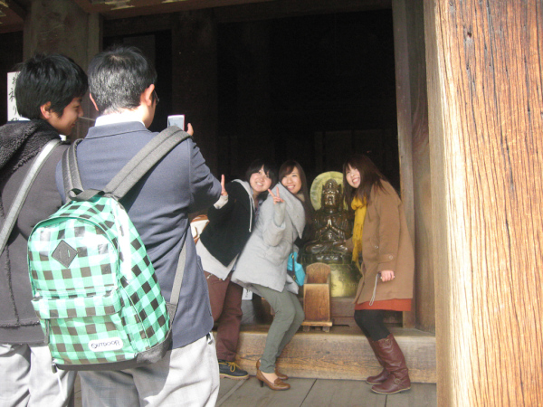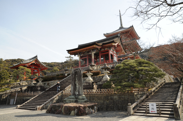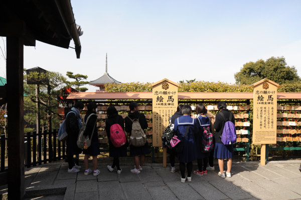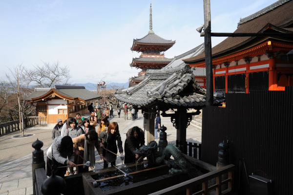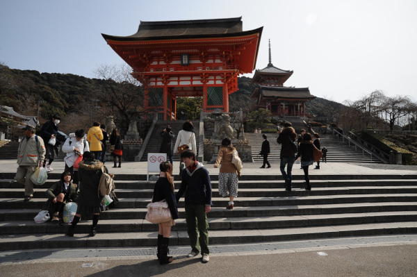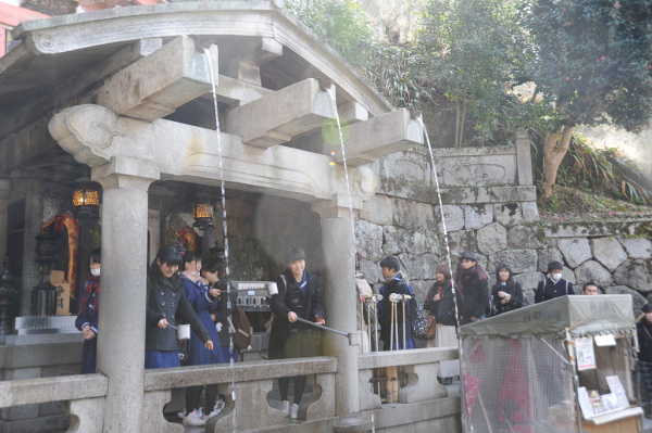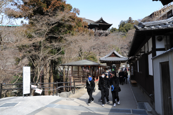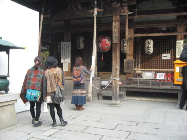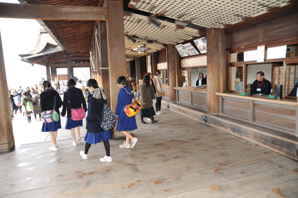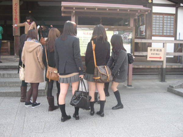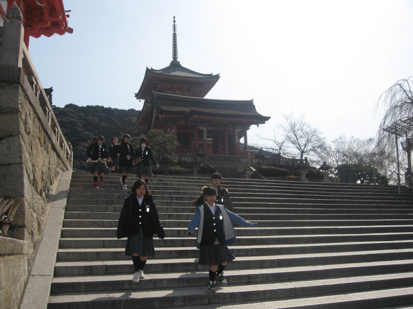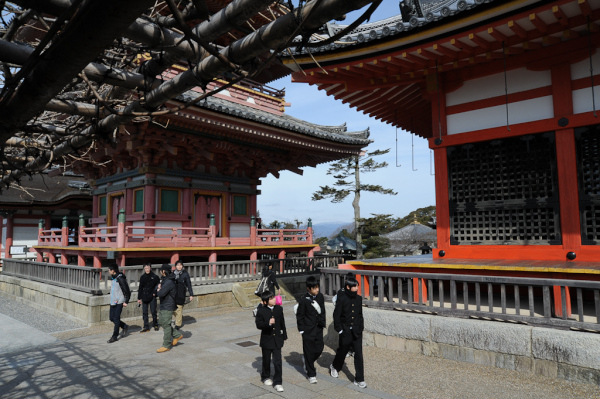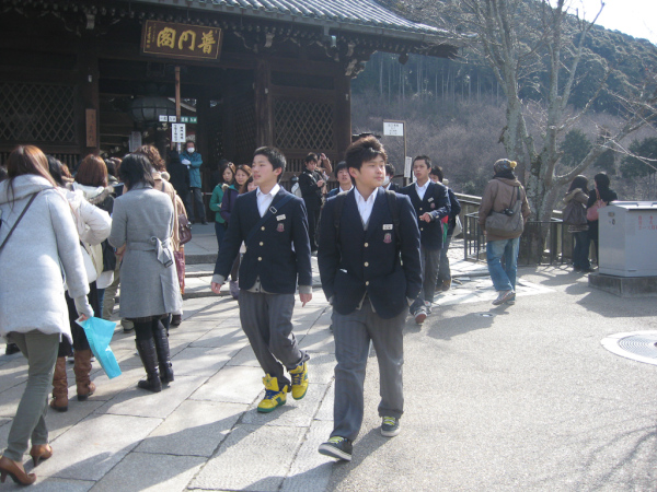 We get off the bus at the Kiyomizu-dera temple. In the travel guide is states, that the Kiyomizu-dera temple is one of the most celebrated in Japan. 1300 years old, this temple was chosen by Unesco as a world heritage site in 1994. This is a place of worship, peace and magic! Outside a leaf blower roars. The temple teems with school children. The students are wearing uniforms. Each school has its own uniform and emblem. They all look the same and the only thing that makes one stand out from the other are the brand school bags and shoes. The boys wear black suits with gold buttons and the girls wear skirts.