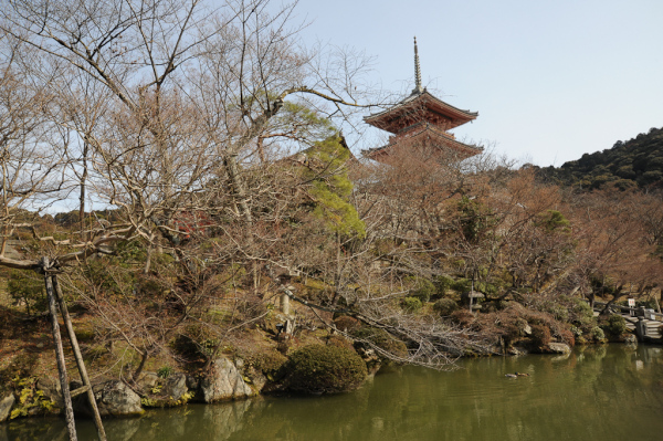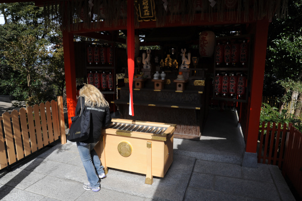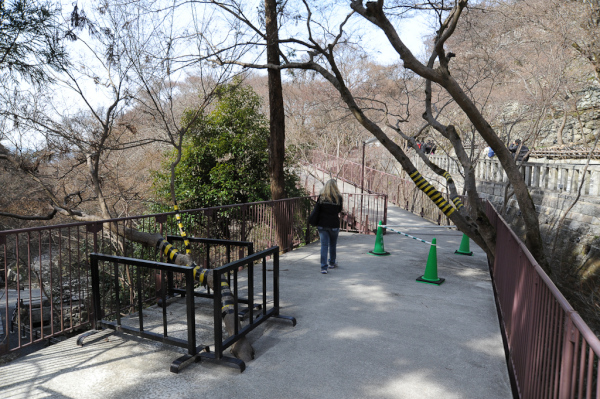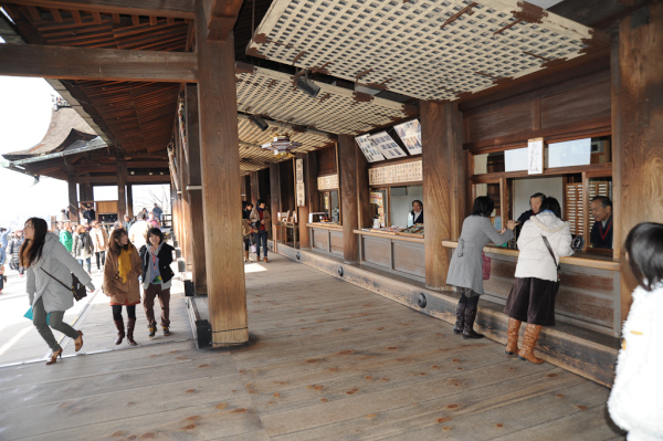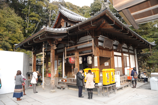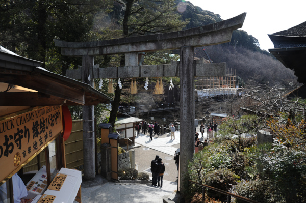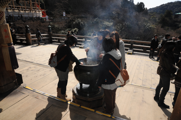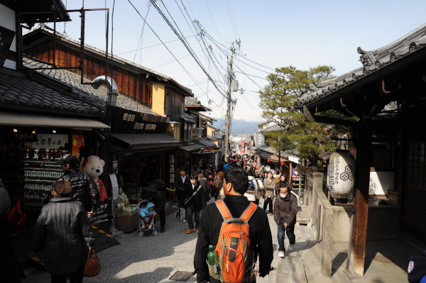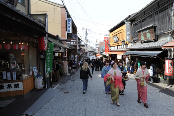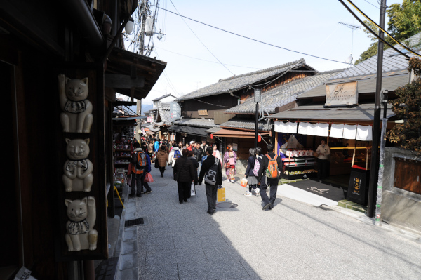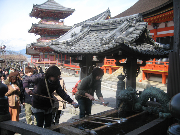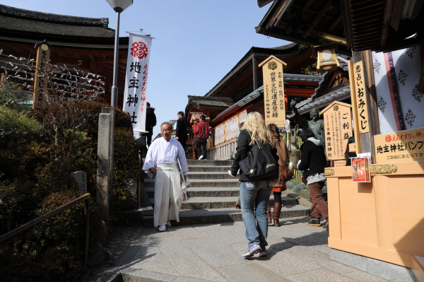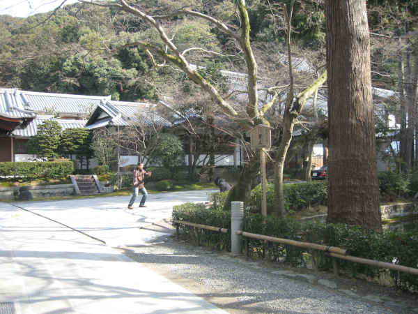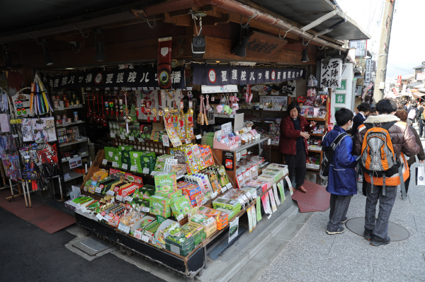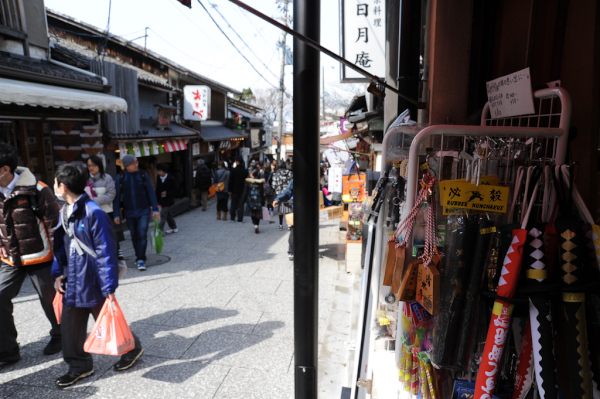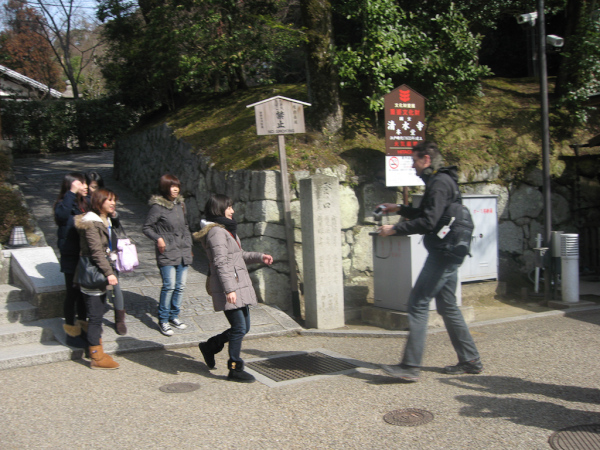 A few steps away from the temple, I see a man exercising Tai Chi. Suddenly frantic agitation. I count eight men in dark blue suits. They all look very important. Everyone wants to help. One of the men guides the ambulance to an injured person, the other 7 look on. The popular expression “jump of the terrace of Kiyomizu” is the Japanese equivalent of “take the plunge,” and at Kiymomizu it means that if one were to jump (it is 13 meters down) and survive, ones wishes would come true! Jumping has been prohibited here, though it was once popular during the 19th century. 234 jumps are documented of which 15% were not successful! It would appear today that the commotion is only a practice rescue operation. We move on.