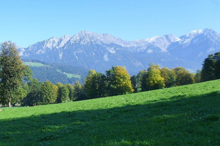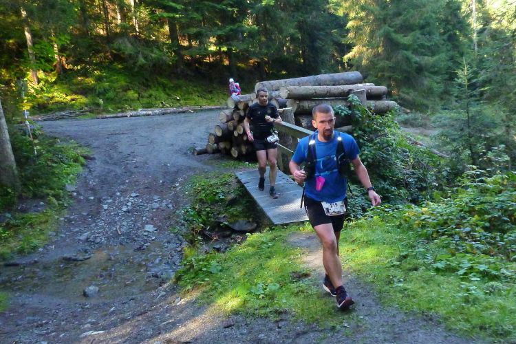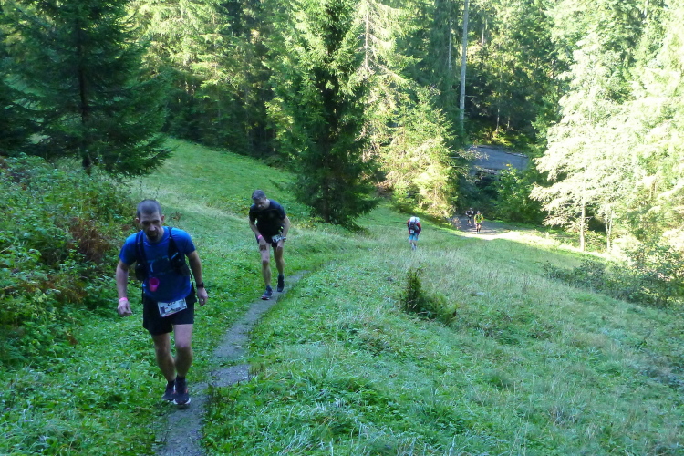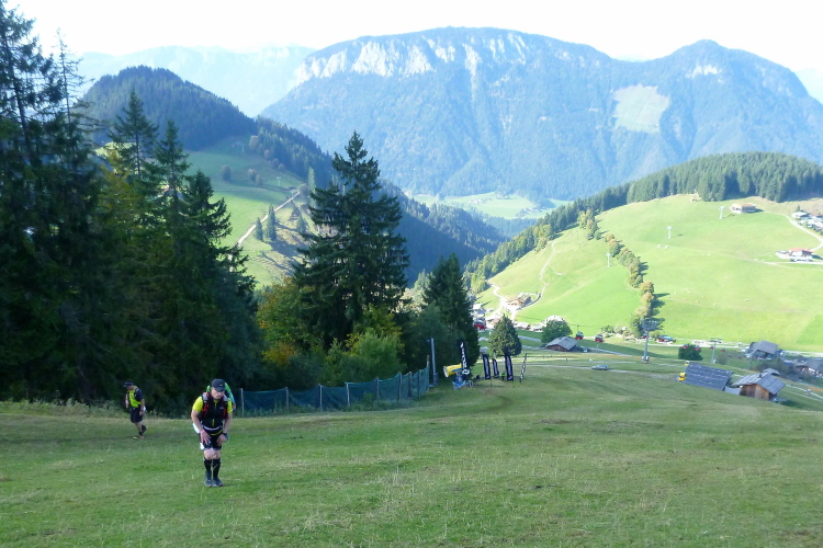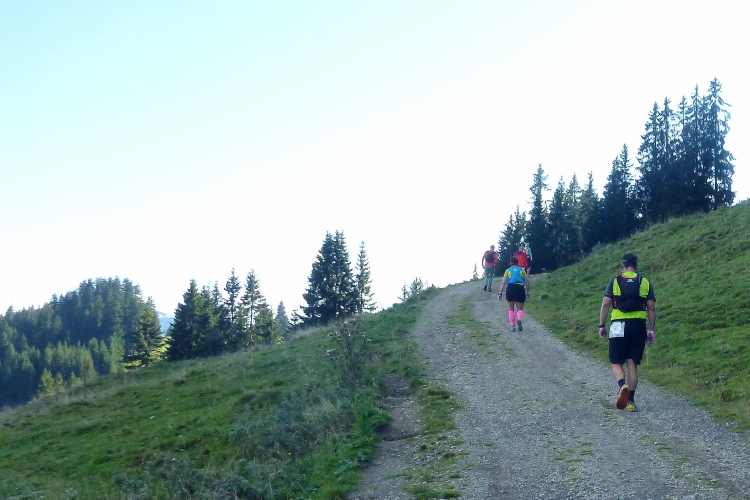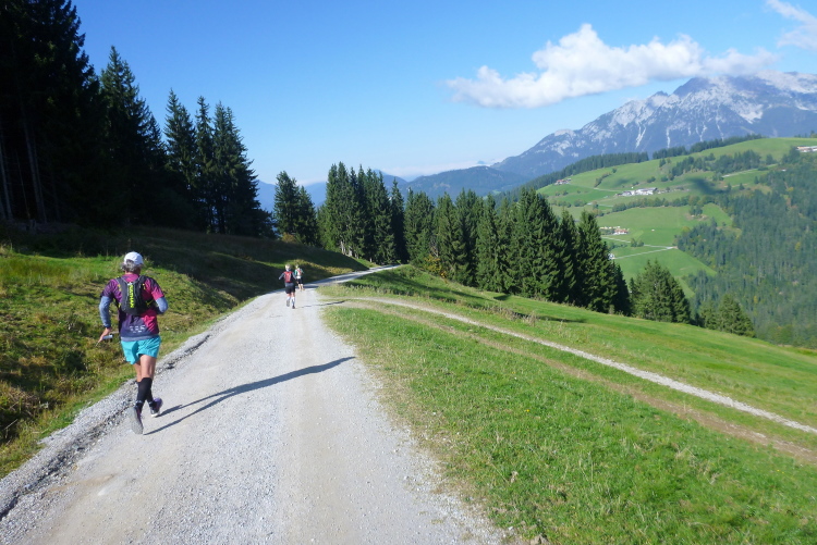 Die kleine gedeckte Auhäuselbrücke führt uns ins Sonnenlicht, das Wetter beginnt herrlich und wird auch so bleiben. Kaiserwetter im Kaisergebirge, was willst Du mehr? Das sprichwörtliche Glück bei meinen Alpeneinsätzen bleibt mir also treu. Das Laufen über sonnendurchflutete Wiesen und Wälder, immer wieder vorbei an attraktiven Bauernhöfen, ist wunderbar. Der erste VP mit Vollversorgung kommt nach etwa 12 km zwar etwas spät, aber ich habe eine Wasserflasche dabei und konnte gut überbrücken. Unter einer Bergbahn hinweg komme ich weiter prima voran, die tollen Ausblicke ins Tal, die schönen, gut zu belaufenden Wege sind eine Freude und das sensationelle Wetter sowieso. Nach fünfzehn km und einigen hundert bereits genommenen Höhenmetern geht’s dann ins Eingemachte: Praktisch zurück auf der Ausgangshöhe von rund 700 m folgt ein Aufstieg von guten tausend Metern auf den nächsten zehn km.