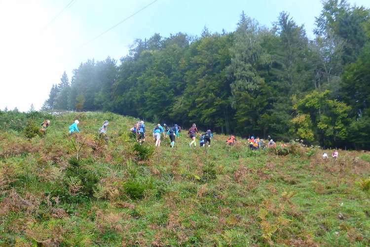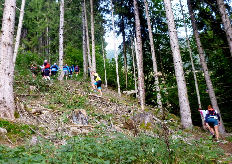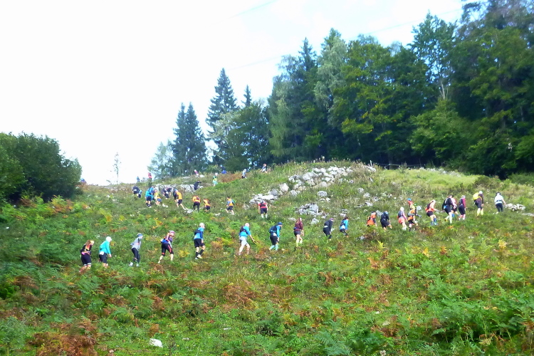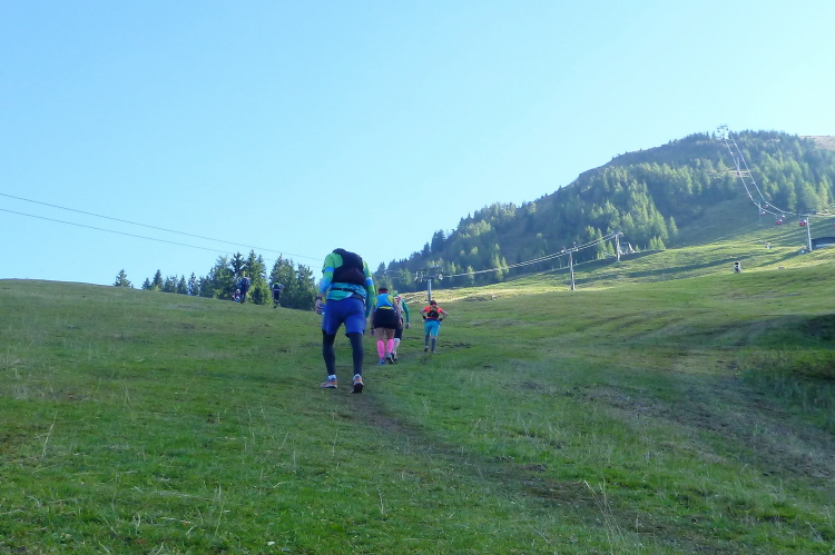 Gerade noch die startenden Stars abgelichtet, geht es kurz darauf auch für mich los. Schnell haben wir das Dorf hinter uns gelassen und befinden uns auf dem bereits mehrfach gelaufenen Trail oberhalb Sölls mit schönem Blick auf selbiges und seine Pfarrkirche. Ein breiter, befestigter Waldweg bringt uns die ersten Höhenmeter, die bald auf sehr schönen Trails und Wiesenwegen ausgebaut werden. Überholen ist hier teilweise schwierig, aber mein Problem ist das eh nicht. Kaum vier km absolviert, informiert man uns per Schild, daß es am Franzleibl steil würde. Das erschließt sich, ehrlich gesagt, sofort unmittelbar persönlich auch ohne Hinweis. Tatsächlich ist das schon der vielleicht schönste Abschnitt des Laufs. Über einen breiten Wiesenhang arbeiten wir uns als wunderbar anzusehende Läuferkette serpentinenartig den sehr steilen Wiesenhang unter einer Stromtrasse hinauf. Klar ist der gemächliche Schritt die bevorzugte Fortbewegungsart in meinem Leistungssegment, und genauso klar ist der traumhafte Blick zurück ins Tal.