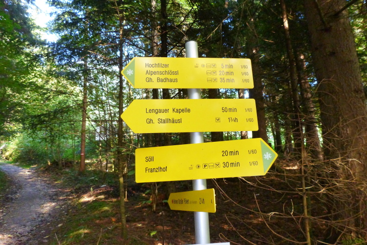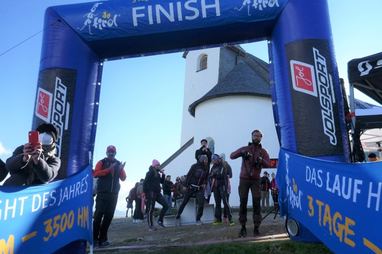Es wird aber langsam absehbar. Ein weiteres, optisch nettes Zwischenziel stellt die Lengaukapelle von 1727 mit imposantem Dachreiter dar, die es sich anzusehen bestimmt gelohnt hätte. Aber die Verlockung des sanften Bergablaufs ist groß, er verheißt das sich nahende Finale der Tour de Tirol, die über drei Tage 75 km und 4.000 Höhenmeter aufzuweisen hatte. Der dritte und letzte VP erwartet uns an km 20, wieder mit Wasser, Iso, Bananen und Riegeln. Halt, die Cola hätte ich fast vergessen, der ich mich jetzt gerne hingebe. Dann ist der Hochfilzer mit seinen bereits beschriebenen tollen hölzernen Ferienhäusern erreicht, fast kommen schon heimatliche Gefühle auf. Die Brennerei Oberkoller wird passiert, bekannt von den drei Dorfrunden am Freitag, und dann geht’s letztmals auf den schönen Wanderweg oberhalb des Dorfes, bevor wir endgültig wieder in Söll einlaufen. Günther, seit einer geschlagenen Stunde im Ziel (n.b.: gestern gekniffen), begleitet mich auf dem letzten km, bevor ich unter dem Beifall meines mobilen Fanblocks zum dritten Mal und nach 3:41 Std. diesmal als einer von 431 Finishern endgültig das Zieltor erreiche.