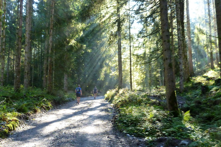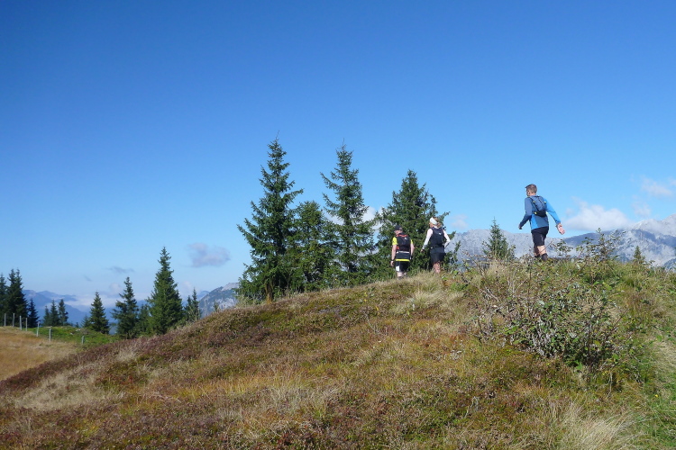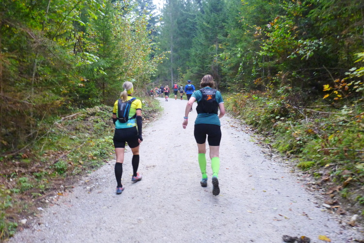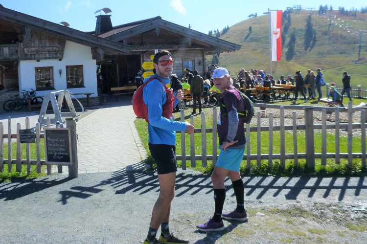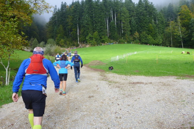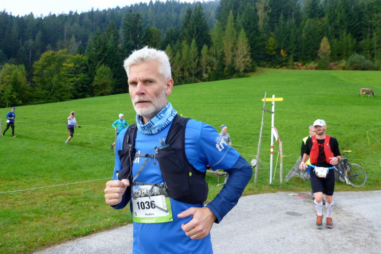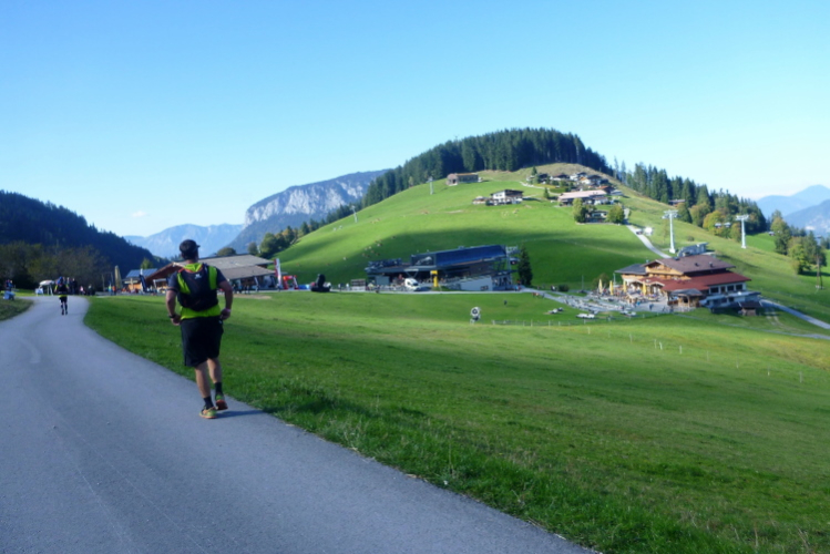 Ich schätze läuferfreundliche Startzeiten, sie ermöglichen sowohl eine ausreichende Mütze Schlaf sowie ein gemütliches Frühstück. Um 9:30 Uhr sind wir dran, die Ultras – ausnahmsweise gibt es zum 15. Jubiläum auch einen Ultratrail über 75 km mit 4.000 Höhenmetern – wurden schon fünf Stunden vorher zu ihren 33 km Anlauf losgelassen. Wie gestern ist es noch frisch, aber aufs versprochene Kaiserwetter brauchen wir nicht lange zu warten. Umgekehrt zum gestrigen Verlauf verlassen wir das Dorf, an der Pirchmoos-Kapelle wird diesmal links abgebogen. Leider bin ich alleine, Günther und Andrea sind zwar anwesend und begleiten Elke einige Stunden, aber eine Hochzeitseinladung hält ihn von der Teilnahme ab.