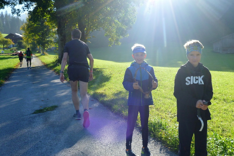 Was werden die Beine morgens sagen? Werden sie überhaupt noch dran sein? Zum Frühstück müssen wir ins Nebengebäude, was ich nach einer schmerzfrei verbrachten Nacht zu einigen wenigen testweisen Laufschritten nutze. Die gestalten sich unauffällig, was mich schon mal enorm beruhigt. Ich hatte durchaus mit der Möglichkeit gerechnet, das Rennen im wahrsten Sinne des Wortes angehen zu müssen. Das wird also erfreulicherweise nicht der Fall sein. Günther und ich werden zwar gemeinsam starten, aber er ist schnell über alle Berge entfleucht, denn er hatte ja gestern mit der faulen Ausrede Hochzeitseinladung gekniffen und ist daher frisch. Und ohnehin sehr viel schneller… Ich freue mich über die bisher führenden drei Mädels und Jungs, die sich gleichermaßen bereitwillig sowie freundlich und nicht im Ansatz abgehoben von mir ablichten lassen. Auf geht’s zur Umrundung des großen (1.595 m) und des kleinen (1.562 m) Pölven!