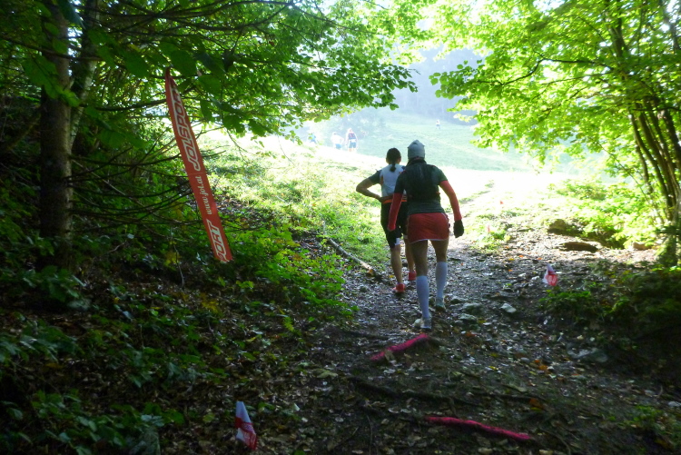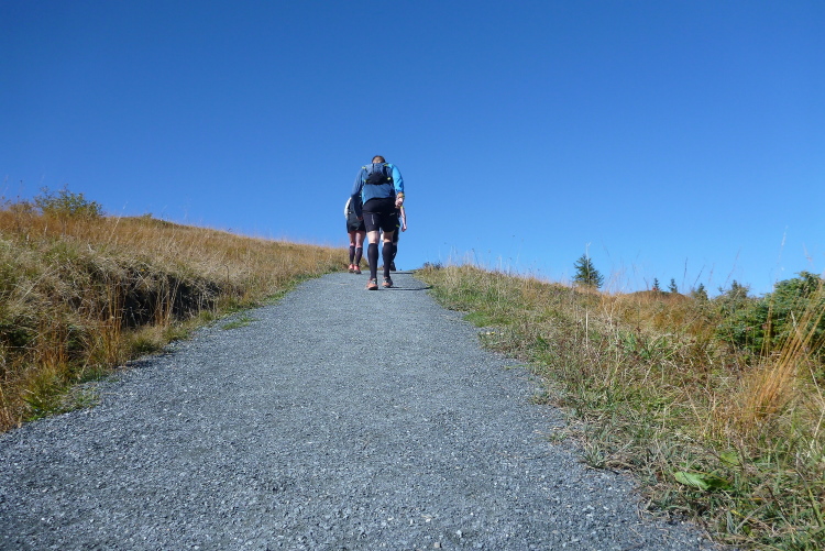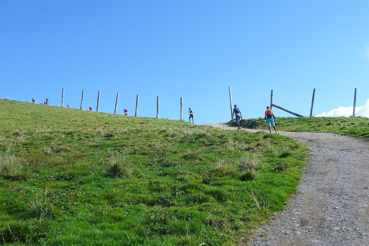 35 km sind vorbei, und erst 4:50 Std. 2:10 Std. für sieben km, das muss reichen. Wer aber schon mal über eine halbe Stunde für einen einzigen km gebraucht hat, kennt den Spruch mit dem Pferd und der Apotheke. Unmittelbar nach dem Abschiedskuss von der besten Ehefrau von allen beginnt der letzte Abschnitt. Wie von zahlreichen Läufen in der benachbarten Schweiz gewohnt, zieren kleine Fähnchen beiderseits des Wegs die nächsten Meter. Die Bahn verläuft jetzt genau über mir. Es folgt ein prüfender Blick in die nächste Gondel und, jawohl, Jacke und Frisur kommen mir bekannt vor. Meinem Schrei folgt ein heftiges Winken aus luftiger Höhe. Dann entschwebt sie in Richtung Hohe Salve, und die ist immer noch unangenehm weit weg und ebenso hoch.