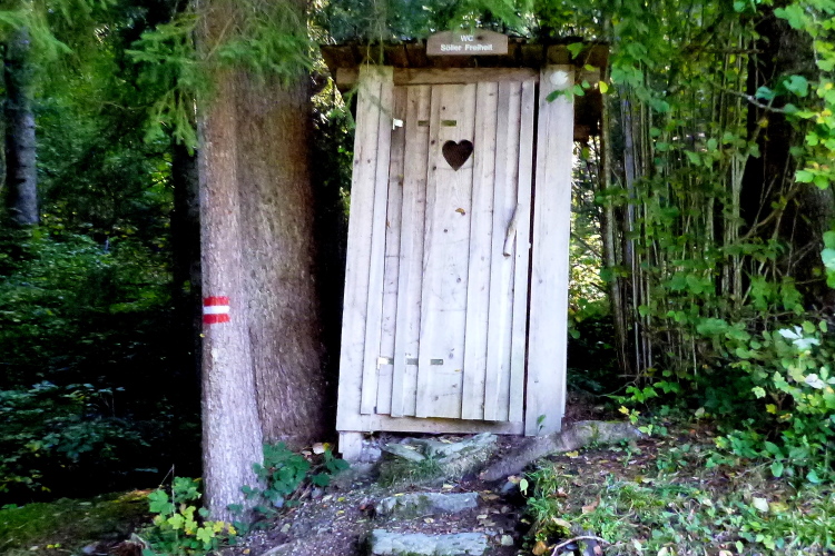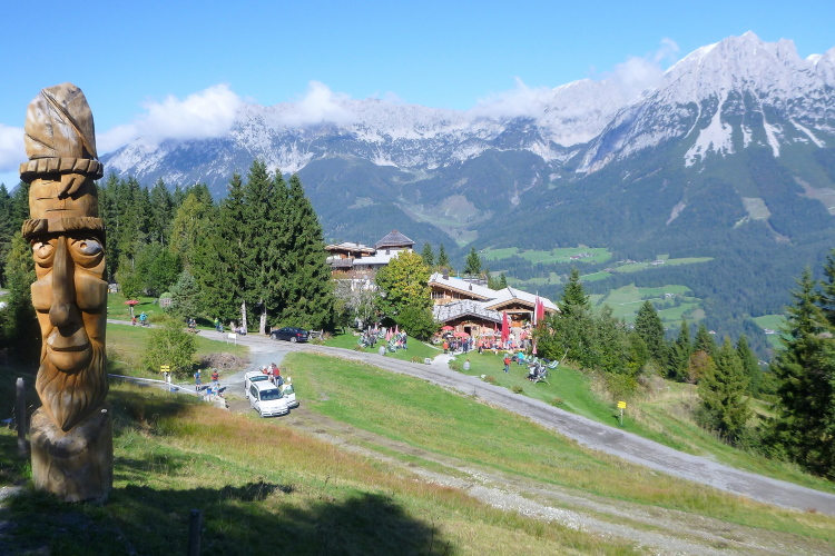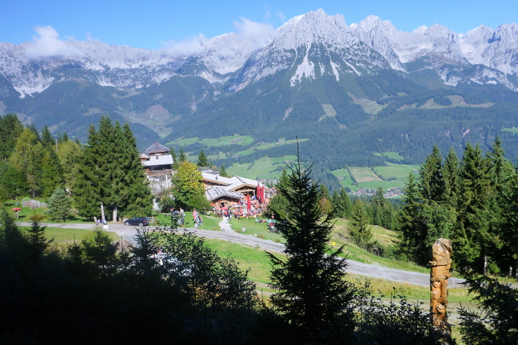 Die Bergstation der Hartkaiserbahn gibt wieder Gelegenheit zum Auftanken und dem Herrn fürs Wetter zu danken. Auf einem markanten Hügel voraus kann ich schon das nächste Zwischenziel, die Mittelstation zur Hohen Salve, erkennen. Erst einmal aber passieren wir einen kleinen See, Wasserspeicher für die Winterbeschneiung der umliegenden Skipisten. Am Wegweiser zur Tanzbodenalm klingelt’s bei mir, da war doch etwas Besonderes? Über die erste Terrasse, dann durchs Gebäude und über die zweite Terrasse wieder hinaus, begleitet vom Applaus der Gäste. Hätt jet, wie man bei uns zu sagen pflegt. 26 km sind geschafft, 3:45 Stunden bin ich (erst) unterwegs. Das sollte doch in sieben Stunden zu schaffen sein.