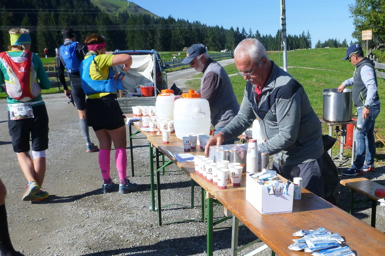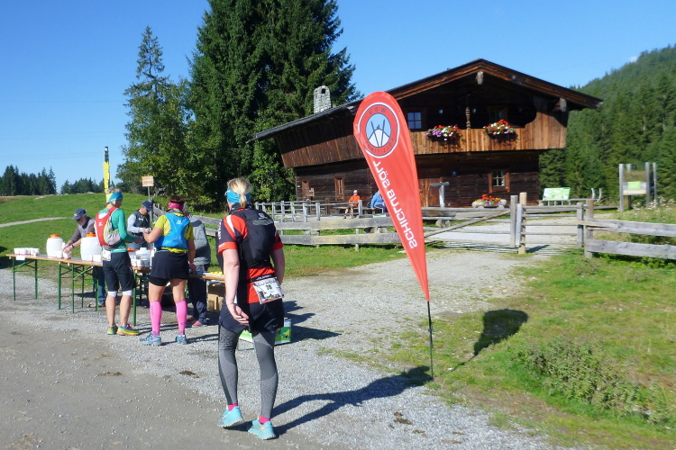 An einigen Gehöften und Pensionen vorbei müssen wir eine erste stramme Steigung nehmen und werden in der Folge mit feinen Trails und schönen Wiesenwegen belohnt. Kurz vor dem Hochfilzer mit seinen markanten hölzernen Ferienhäusern sind die ersten fünf km im Sack. 35 Minuten bisher, so kann es gerne weitergehen. Wird es aber natürlich nicht. Es folgen der wunderbare Blick auf Söll von gestern. Nach 7,5 km sind wir wieder am Start und verlassen das Dorf ostwärts. Elke hat in der Zwischenzeit meinen vergessenen Becher geholt, der in dem Startsackerl enthalten war. Die Absicht, den wie empfohlen zu nutzen, ist zwar löblich, aber gebraucht hätte ich ihn im weiteren Verlauf nicht, denn überall werden die Getränke in einer ausreichenden Zahl Becher angeboten.