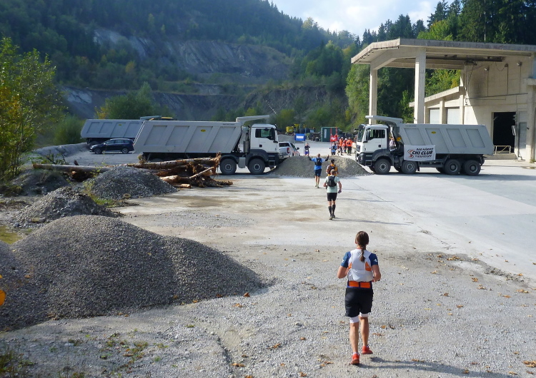 Unser nächstes Zwischenziel ist der nur unweit entfernte Steinbruch, den ein in den Berg führendes Tor des ehemaligen Perlmooser Zementwerks ankündigt. Nach wie vor erfolgt, wie uns eine Schautafel aufklärt, der Abbau des Wettersteiner Kalks, der sich aufgrund des hohen Gehalts an Kalzium (98%) und des geringen an Magnesium optimal für die Zementherstellung eignet. Nur einmal im Jahr ist das Betriebsgelände für Nichtmitarbeiter geöffnet, und das ist exakt heute, die Schranken dürfen wir ignorieren. Optisch beeindruckend ist der über weite Strecken angenagte Berg und die ein Tal überspannende Hochbrücke ein hübsches Fotomotiv. Einen ganz besonderen Witz hat man sich an der Labe bei km 12 (Hauptbetriebsgelände) erlaubt: Zwei Muldenkipper stehen sich gegenüber, den Zwischenraum hat man mit einer großen Ladung gebrochenen Kalks gefüllt. Über diesen „Berg“ müssen, nein, dürfen wir zwischen zwei Slalomtoren des Skiclubs Bad Häring hindurchlaufen. Klasse Idee! Am VP gibt’s sogar Bier (das ich als einer der Wenigen nicht verschmähe, übrigens auch MIT Umdrehungen), unser Toni darf also ebenfalls beruhigt hier erscheinen.