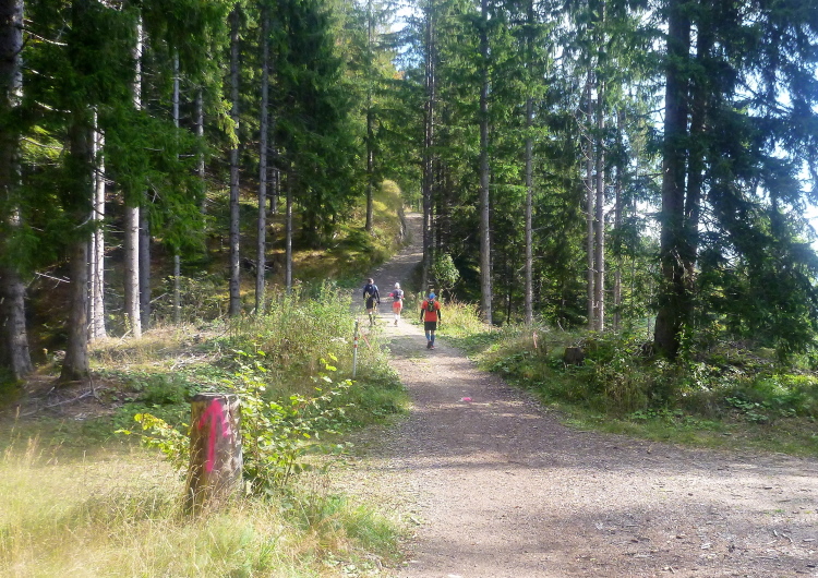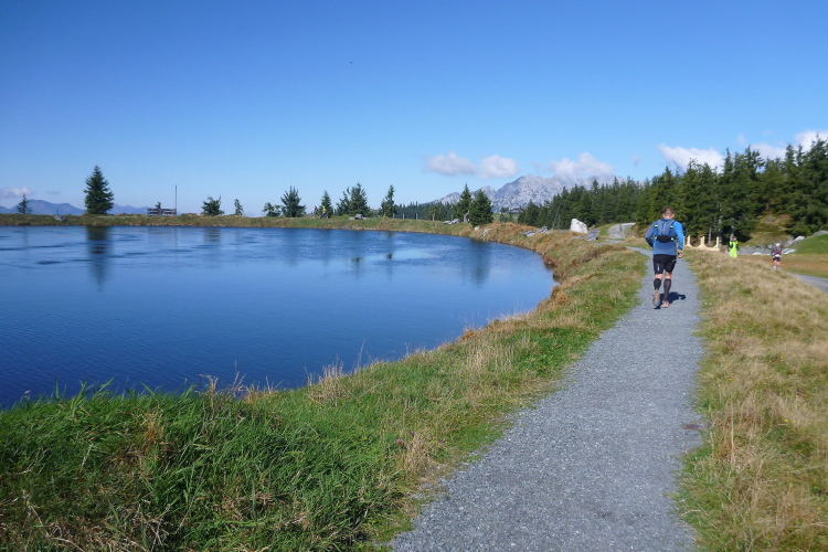 Aber o weh, weiter müssen wir hinauf, auf gutem Weg zwar, aber sehr langsam. So viel an einem Stück bin ich wahrscheinlich innerhalb eines Rennens noch nie marschiert. Traumhaft ist jedenfalls der Blick zurück, ebenso die folgende Verpflegung, genau zum richtigen Zeitpunkt. Entlang des Eibergs (1.673 m) umrunden wir den Jochstubnsee fast zur Gänze. Zinsberg, höher und höher schleppe ich meinen müden Körper empor, immer das Schreckensszenario von über sieben Stunden im Hinterkopf. Dann sehe ich plötzlich das Ziel: Au Backe, ein wunderschöner Kegel mit einem Gebäude auf der Spitze, allerdings elend hoch. Und zwischen mir und ihm eine gewaltige Senke. Nützt alles nichts, erst einmal am Filzalmsee entlang weiter voran. Lange wird jetzt bergab gelaufen, der Erlebnispark Hochsöll/Hexenwasser an der Grindlalm lautet das nächste Zwischenziel. Das Gebiet um die Hohe Salve galt früher als Hexenland: Die zauber- und heilkundigen Frauen, die hier lebten, wurden von der Bevölkerung zugleich gefürchtet und verehrt. Hier ist der Umsteigepunkt in die Bergbahn Hohe Salve, hier sollte die Gattin stehen. Tut sie auch, die Anfeuerung ist Gold wert.