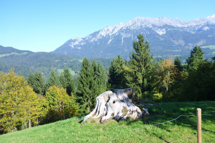 Noch zehn km verkündet das nächste Hinweisschild am SPZ Steig, es würde steinig, aber schön. Schau’n mer mal. Nach ein paar weiteren hundert Metern bin ich geneigt, das zu unterschreiben. Wunderbare Wurzelwege und auch gut zu belaufende, schmale Trails – so, wie ich sie liebe – machen Appetit auf noch mehr. Im Zurückblicken erhasche ich einen tollen Blick auf den vom Kalkabbau arg dezimierten Berg. Wer vorne um Zeiten hastet, dem entgeht vieles, das wir Langsamen uns anzuschauen erlauben können, solange wir nur im Zeitlimit bleiben. Als nächstes Ziel gilt es das Juffinger Jöchl am Paisslberg zu erklimmen, mit 1.181 m Höhe der Scheitelpunkt unseres heutigen Abenteuers. Falls ich es noch nicht erwähnt haben sollte: Söll liegt auf knapp 700 m Höhe. Der Abstieg wird dann haarig. Nach insgesamt 17,5 km und (für mich) schwierig unfallfrei herabzusteigendem, steilem Wurzelpfad muss ich mir eingestehen, keine Lust mehr zu haben. Zum Abreagieren gibt’s danach einen schönen Wiesenpfad.