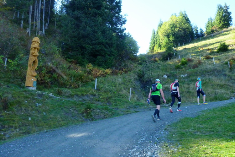 Ein zumindest optisches Gedicht stellt die Rübezahlalm auf etwa 1.200 m Höhe nach 20 km dar, lt. Günther die Alm der Region schlechthin. Sehr gut werden wir verpflegt, allerdings neben den Gebäuden. Markant und klasse anzusehen sind die zahlreichen, aus vollen Baumstämmen geschnitzten Skulpturen, die uns im weiteren Verlauf begleiten werden. Schnell gewinnen wir weiter Höhe, die Bergbahn wird unterquert. Nicht ganz im Klaren über meine Platzierung im Feld (sicherlich nicht ganz hinten) habe ich schon gewisse Bedenken, ob es heute reichen wird. Sieben Stunden haben wir Zeit, als Referenzwert dient mir der Brixen-Dolomiten-Marathon mit seinen direkt vergleichbaren Höhenmetern. Sechseinviertelstunden hatte ich dort vor drei Jahren auf die Plose, den Brixener Hausberg, benötigt, da ist heute nicht sehr viel Luft nach oben.