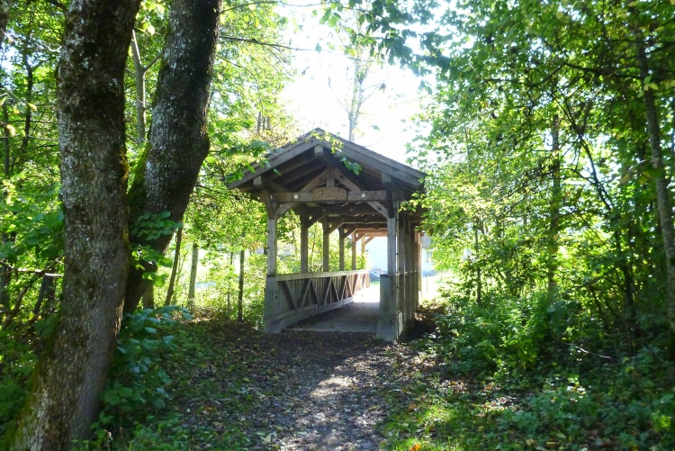 Drei km weiter verlieren wir auf dem Hias Ortner Steig, teilweise seilgesichert, jede Menge der gerade erarbeiteten Höhenmeter. Dies wird auch das Prinzip der restlichen Strecke sein: Wie gewonnen, so zerronnen. An einigen Stellen bin ich froh, keine Stöcke dabeizuhaben, denn ich brauche alle vier Extremitäten zum Kraxeln. Über Wiesen und durch Wald auf breitem, optimal zu belaufendem Fahrweg befinden wir uns in Richtung Bad Häring, das wir allerdings nur rudimentär zu Gesicht bekommen werden. Dafür präsentiert sich rechterhand Aufing im Frühnebel. „Baden erlaubt“ gestattet uns ein weiteres Schild, als wir uns dem beeindruckenden Wasserfall Bad Häring nähern. Im Sommer vielleicht tatsächlich denkbar, verzichte ich, selbstverständlich nur aus Zeitgründen, hier und jetzt darauf. Wieder ist Klettern angesagt, das aber noch Spaß macht. Noch.