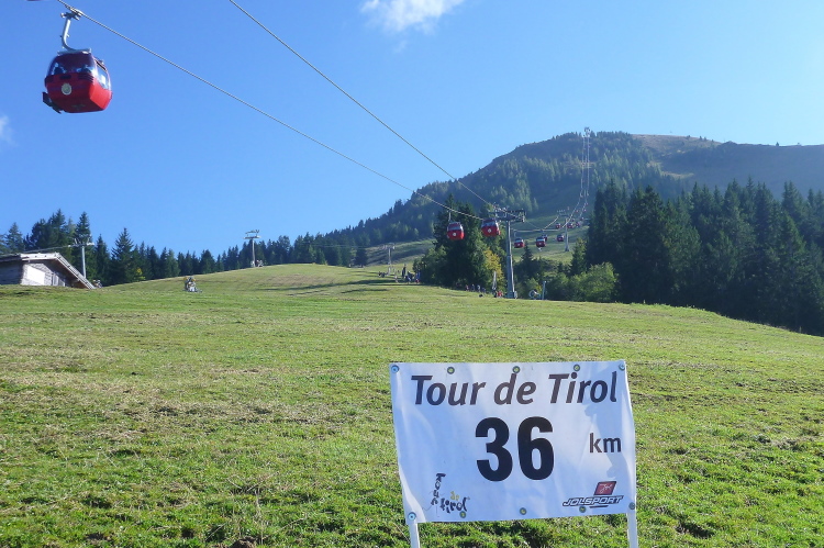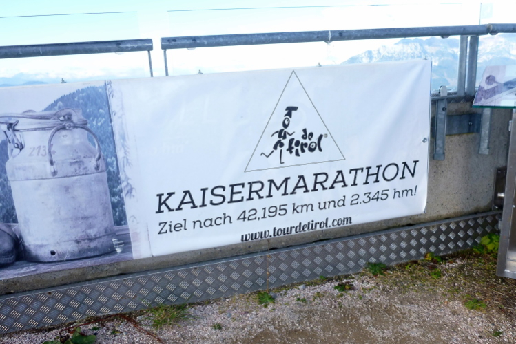Die trockene Kleidung hatte man vorher abgeben können, sie wird an der Mittelstation wieder ausgegeben. Meine hat Elke im Rucksack, weshalb ich nicht sofort talwärts fahren muss. Auf der dem Ziel gegenüberliegenden Seite ziehe ich mich auf einer Bank um und genieße sonnenbeschienen gleichermaßen die herrliche Aussicht und das ausgedehnte Gespräch mit einem netten, sehr sportlichen 76jährigen Einheimischen. Irgendwann müssen wir uns dann doch loseisen und sind wenige Minuten später zurück in Söll und nach einem kurzen Fußmarsch in der Unterkunft. 362 Teilnehmer sämtlicher heutzutage vorstellbarer Geschlechter haben das Ziel innerhalb von gut siebendreiviertel Stunden erreicht.