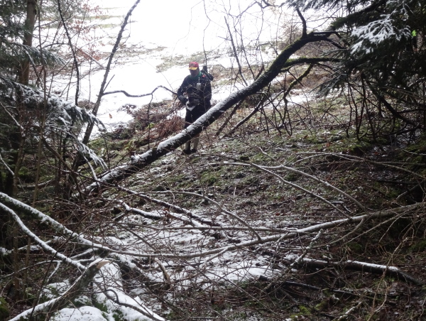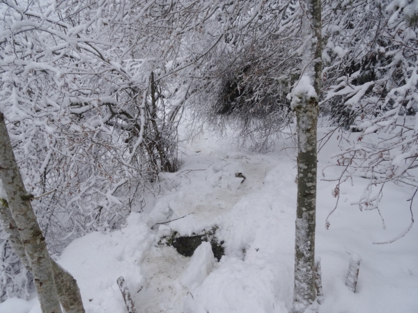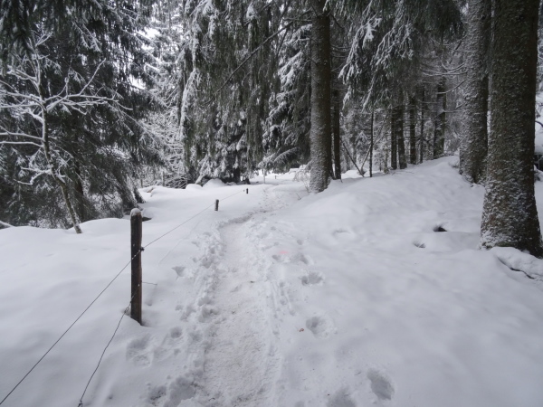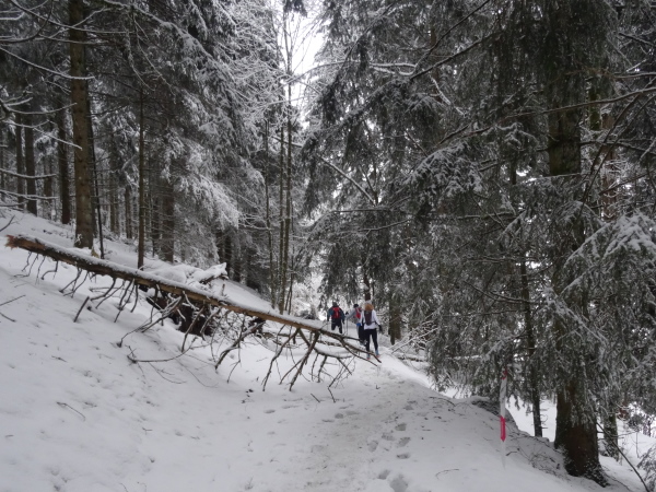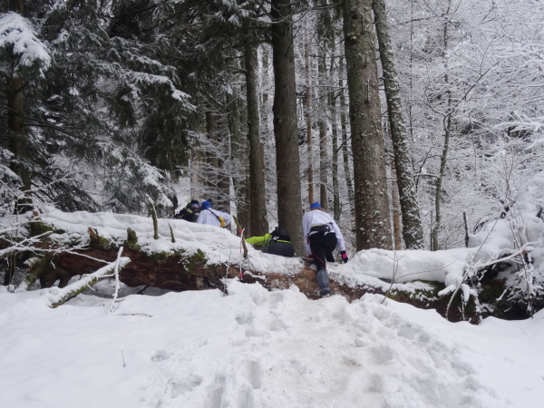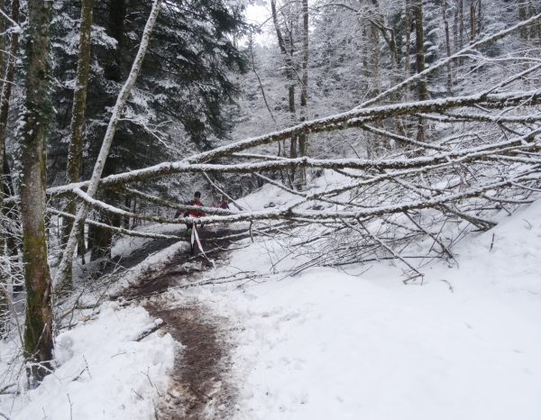 Nach ca. 3 Km geht es dann in den Wald mit immer mehr Schnee auf dem Pfad. Hätte ich nicht so viele Trailer vor mir, die mir mit ihren Spuren den Weg weisen, wer weiß, vielleicht hätte ich mich verlaufen. Erste querliegende Bäume müssen überklettert werden und bei besonders steilen Stücken kommt man nur auf allen Vieren voran. Ich könnte mich ohrfeigen, dass ich ohne meine Tracks unterwegs bin. Ich bin aber nicht der einzige Idiot.
