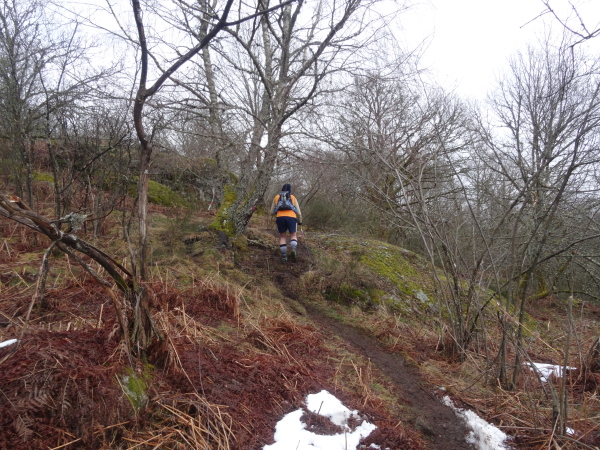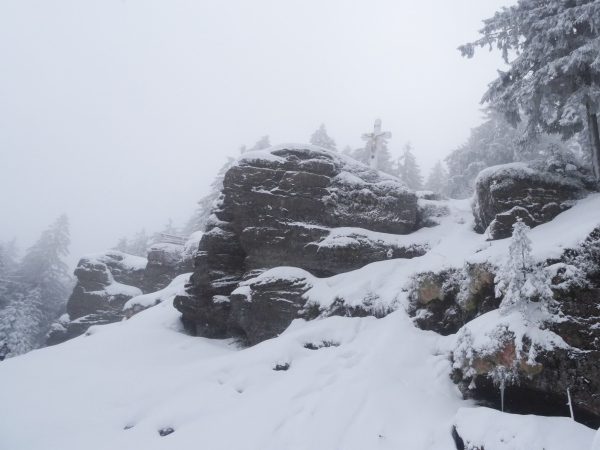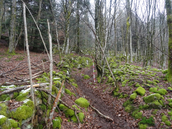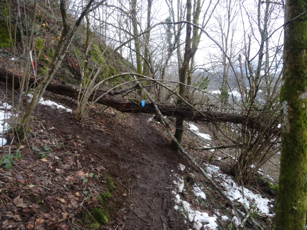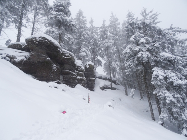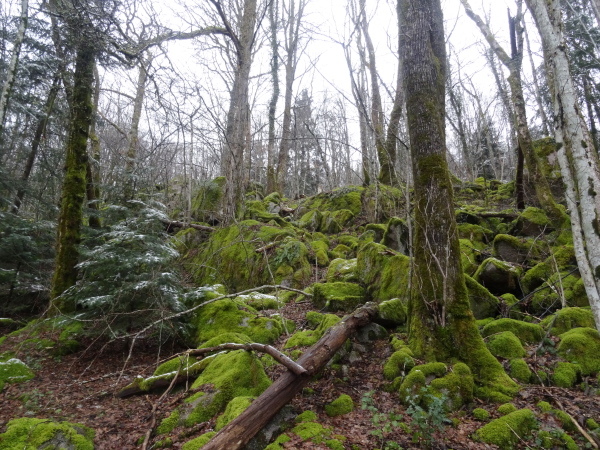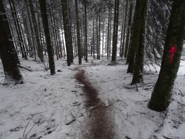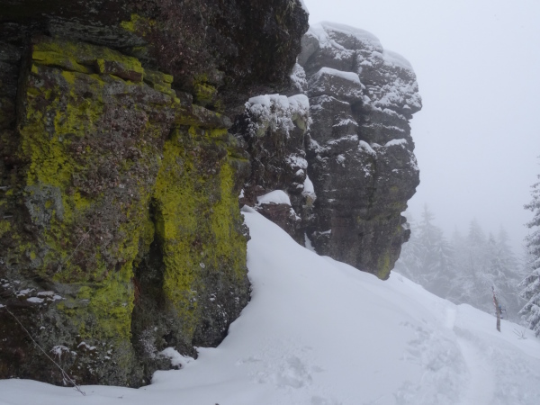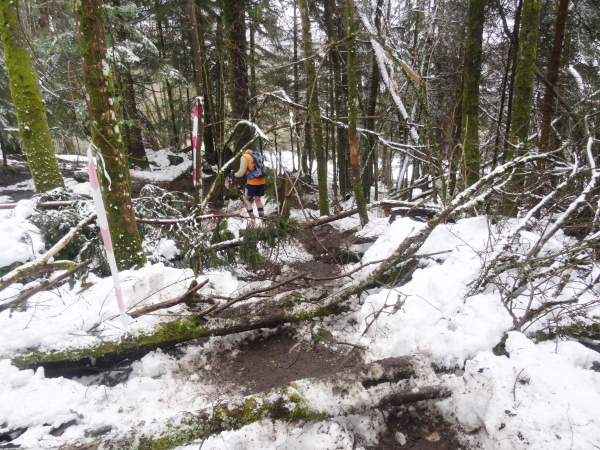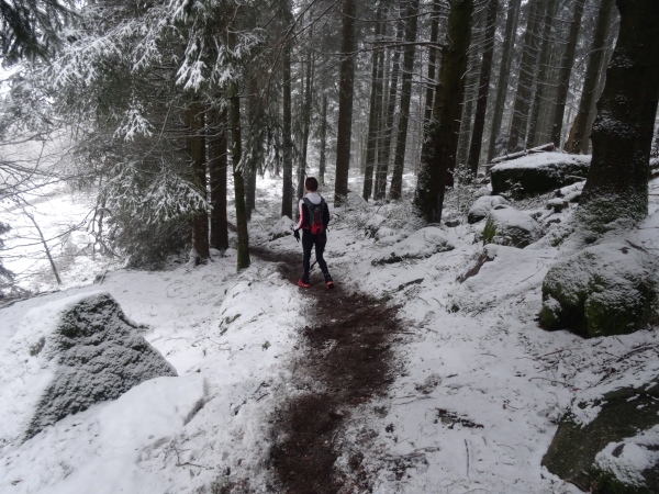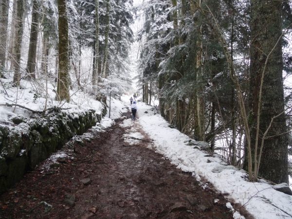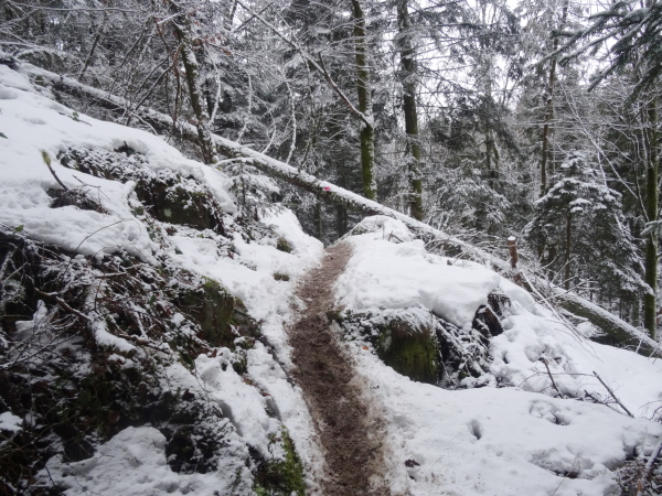 Beim Aufstieg zum Haut du Roc bin ich viel und lange allein. Stellenweise muss ich mich sogar durch Unterholz schlagen. Oben am Gipfelkreuz kann ich dann auf zwei andere Trailer aufschließen. Beim Abstieg bin ich aber wieder, den Fotostopps geschuldet, solo. Die für die Vogesen typische Felsformationen sind einfach zu schön. Auf den nächsten 8 Km geht es ausschließlich bergab. Je tiefer es geht, desto weniger wird der Schnee und umso matschiger die Wegstrecke. Ganz nach der Devise: No Matsch, no Fun.