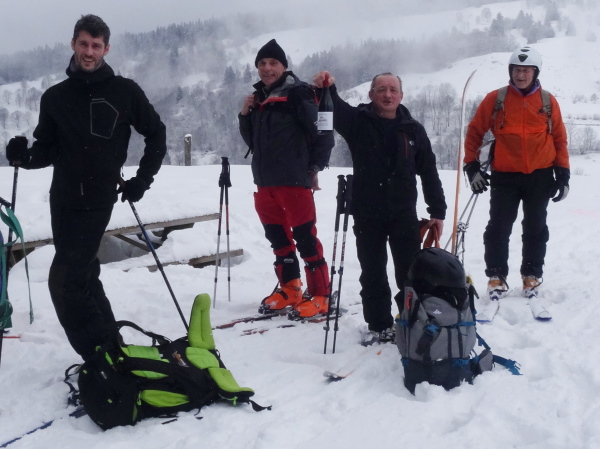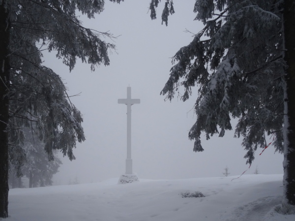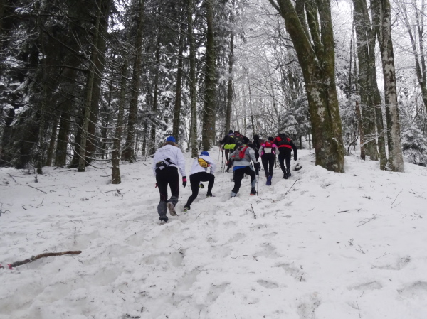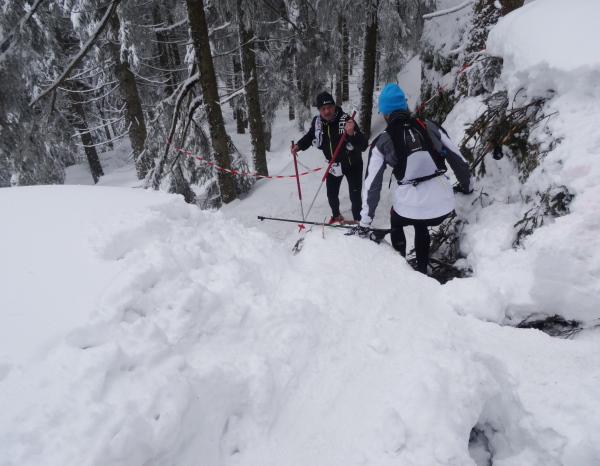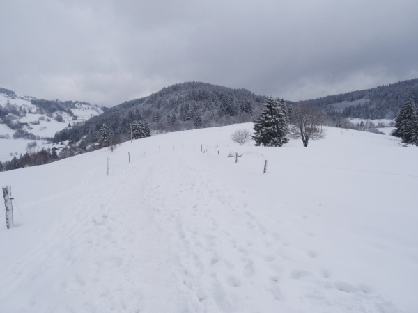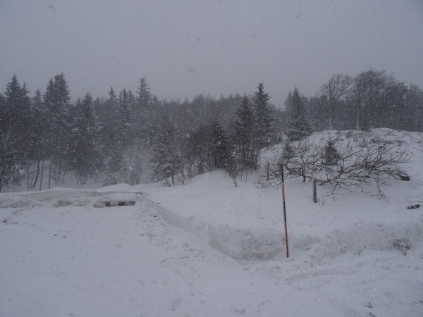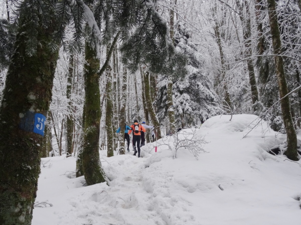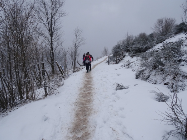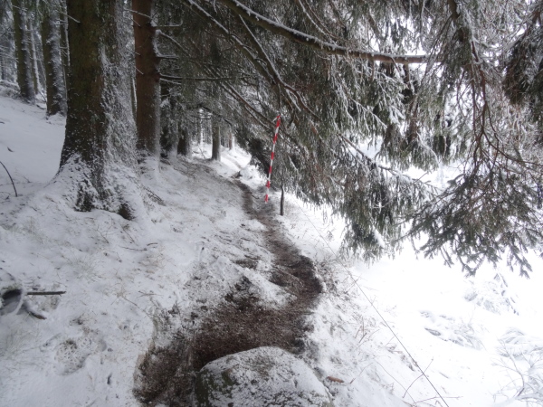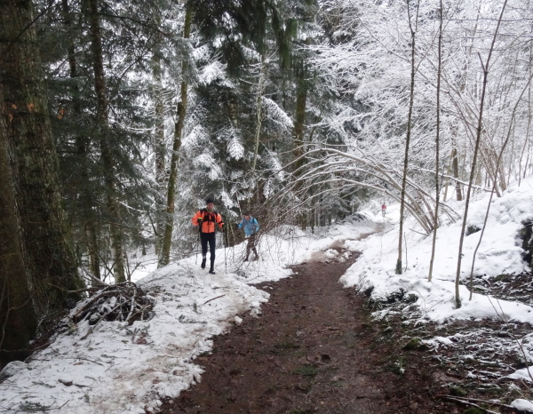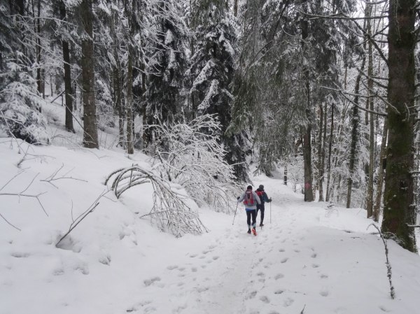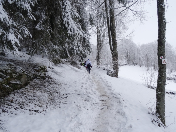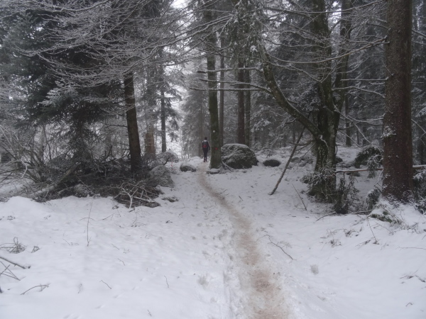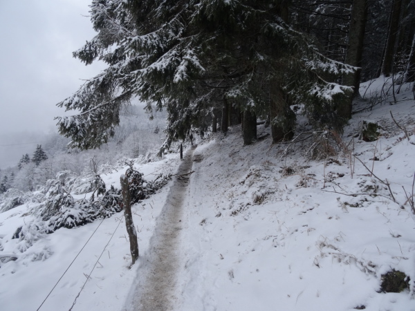 Bei Km 4 haben wir den zweithöchsten Punkt auf ca. 920 mtr. erreicht. Bis Km 7 geht es dann auf 805 müNN bergab. Dabei wird die eine und andere Rutschpartie hingelegt. Ab dem Bergweiler Rupt da Bamont geht es wieder bergan. Schnee, Schnee und noch mehr Schnee lassen bei mir mittlerweile nur noch ein schnelles Wandern zu. Vor mir erblicke ich eine bewaldete Kuppe, zu der die Fußspuren führen. Es geht hoch zum höchsten Punkt, dem „Haut du Roc“ auf 1015 müNN. Eine kleine Gruppe Skifahrer, der ich auf meinen Weg begegne, reicht mir zur Stärkung den mitgeführten Gewürztraminer. Merci.
