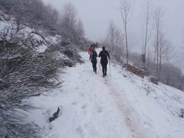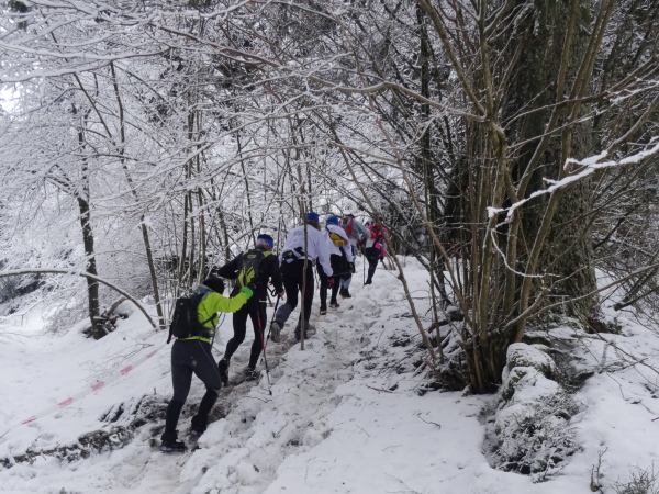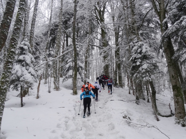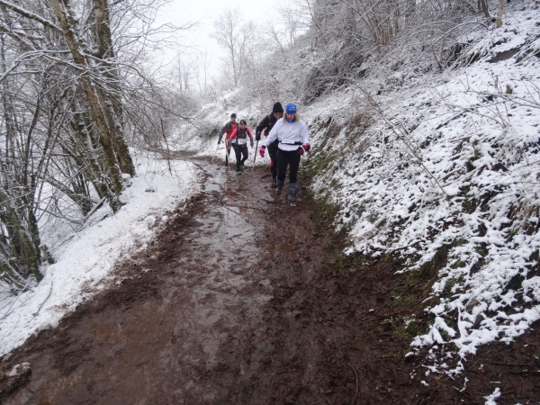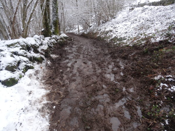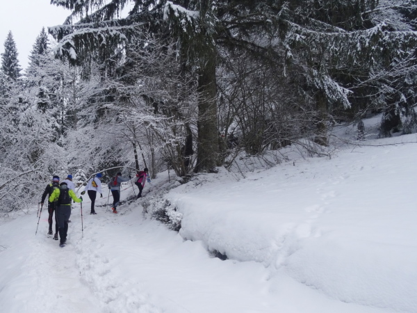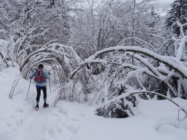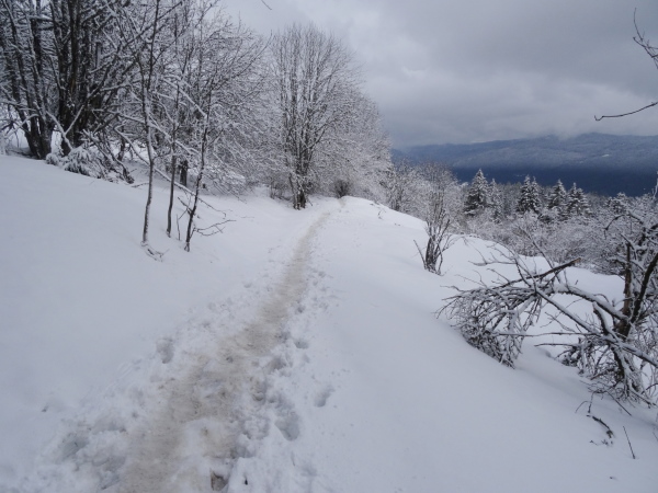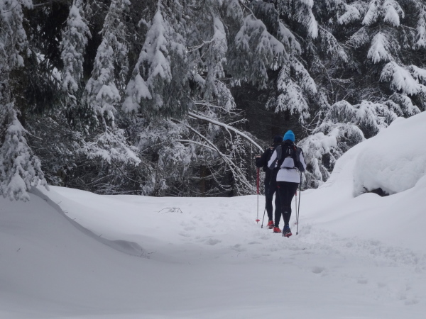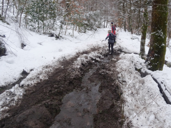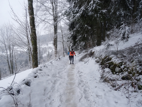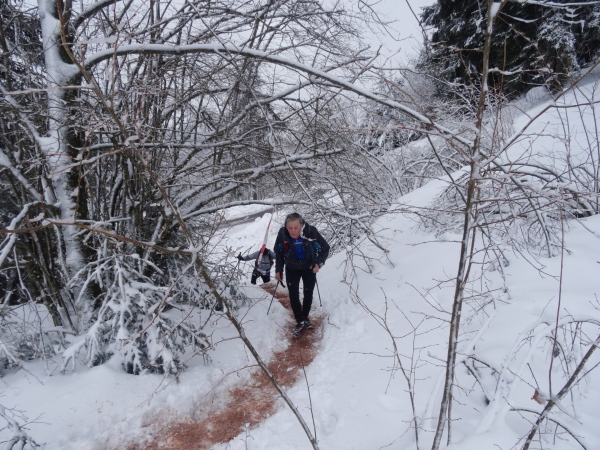 Nach diesem ersten Kraftakt geht es weiterhin in langen Serpentinen den Berg hoch. Nach Verlassen der Fahrstraße geht es dann auf einen tief verschneiten Waldweg am Berghang kontinuierlich bergan, die vielen „Vorläufer“ haben ihre Spuren hinterlassen. Streckenweise ist der Schnee am Tauen und der Weg besteht dann aus tiefem Matsch. Umso höher wir steigen, desto weißer wird der Pfad wieder.